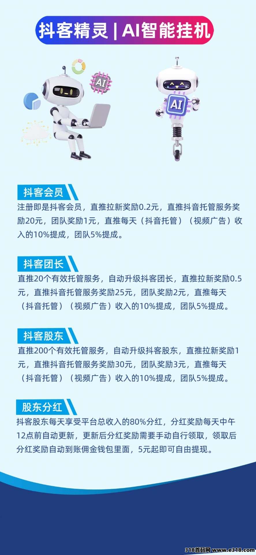 抖客股东:直推200个有效托管服务,即是抖客股东,直推托管服务奖励30元,团队3元。