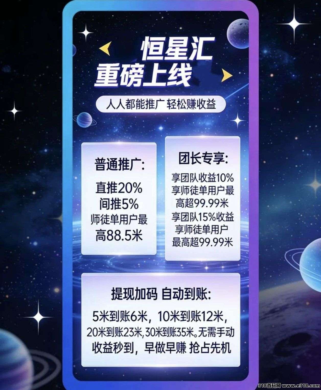 恒星汇,零撸广告赚,保底收益高,放水中,拉新奖励,新品上线,邀请日入几十米,顶包6k,提5到账6提10到账12,看广告红包1000-6000