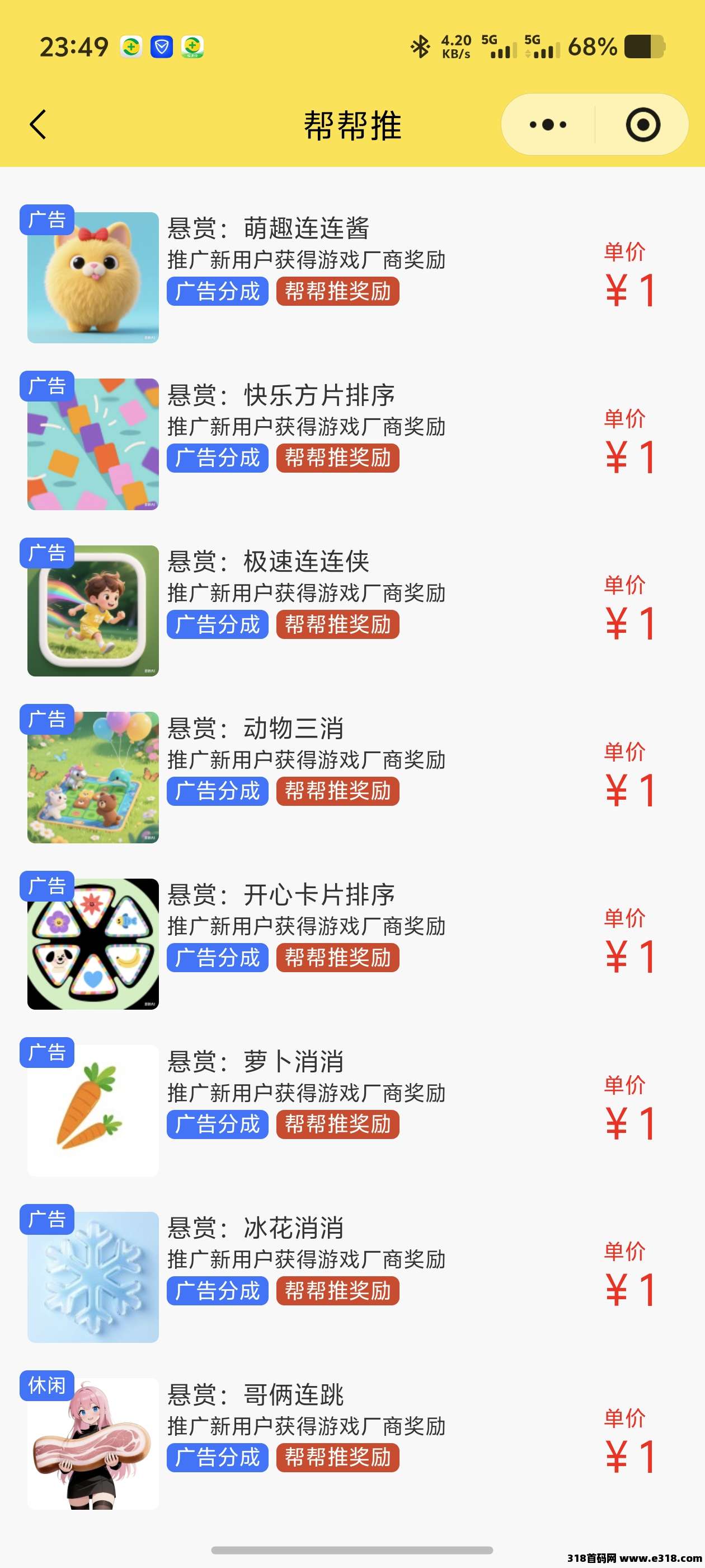 微信扫码进入小程序在首页面找到推推帮目前13个悬赏小游戏目前单价一元一个每周更新新的悬赏任务每天只能申请两个申请试玩看广告按照要求完成以后第二天查看收益申请的悬赏只有一次收益推广收益单条链接每天最高十元但是申请的那个游戏广告收益每天都有只要每天玩看广告都有收益但是悬赏只有一次奖励除了悬赏有限制以为其他的小程序都可以申请没有限制只要试玩看广告就有收益无需下载微信小程序里面就能操作