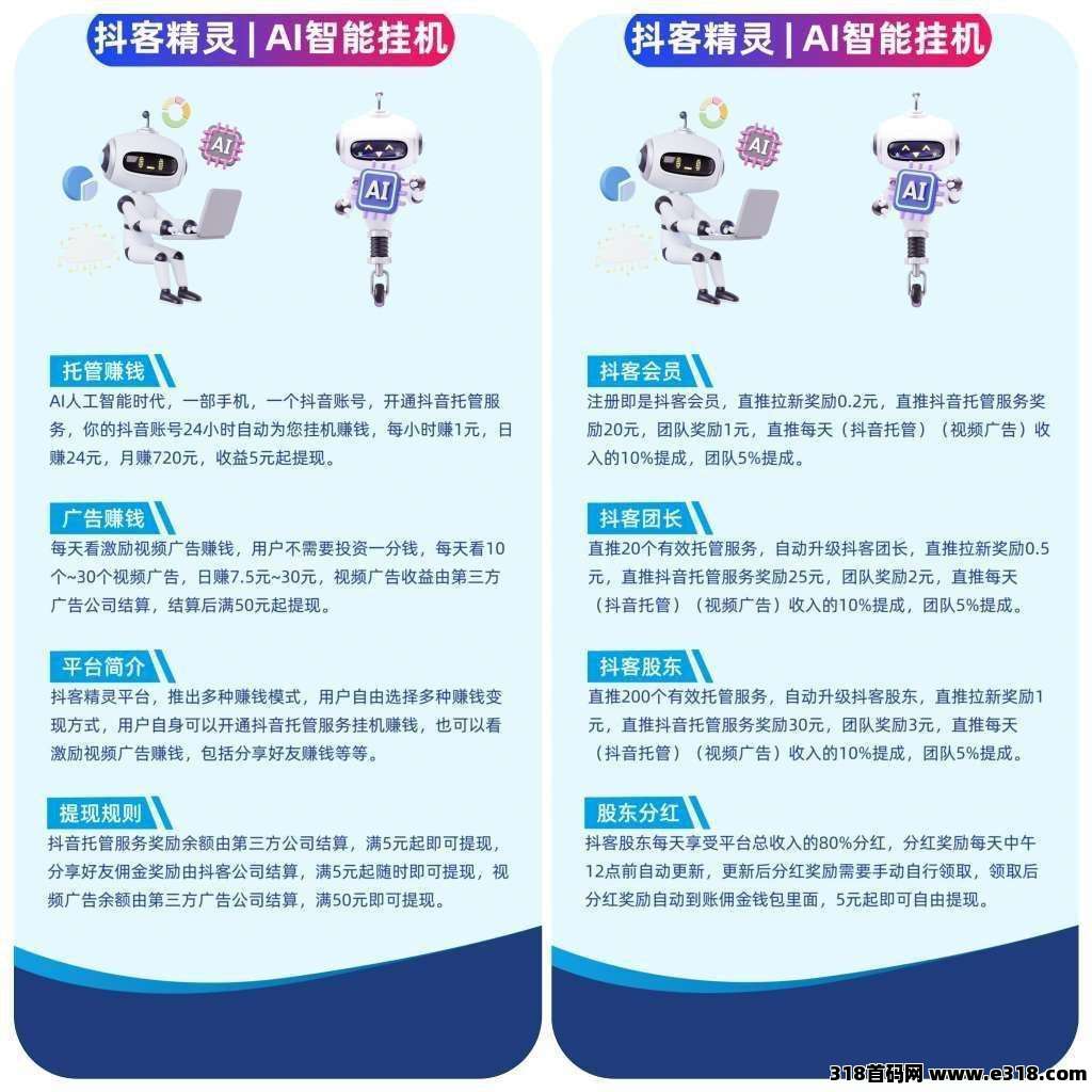 抖客精灵,零撸DY挂机平台,广告赚保底收益高,不养机,拉新奖励,新品上线,一个抖音账号,托管抖音服务,**挂机日赚24米,满5米起提现秒到账。