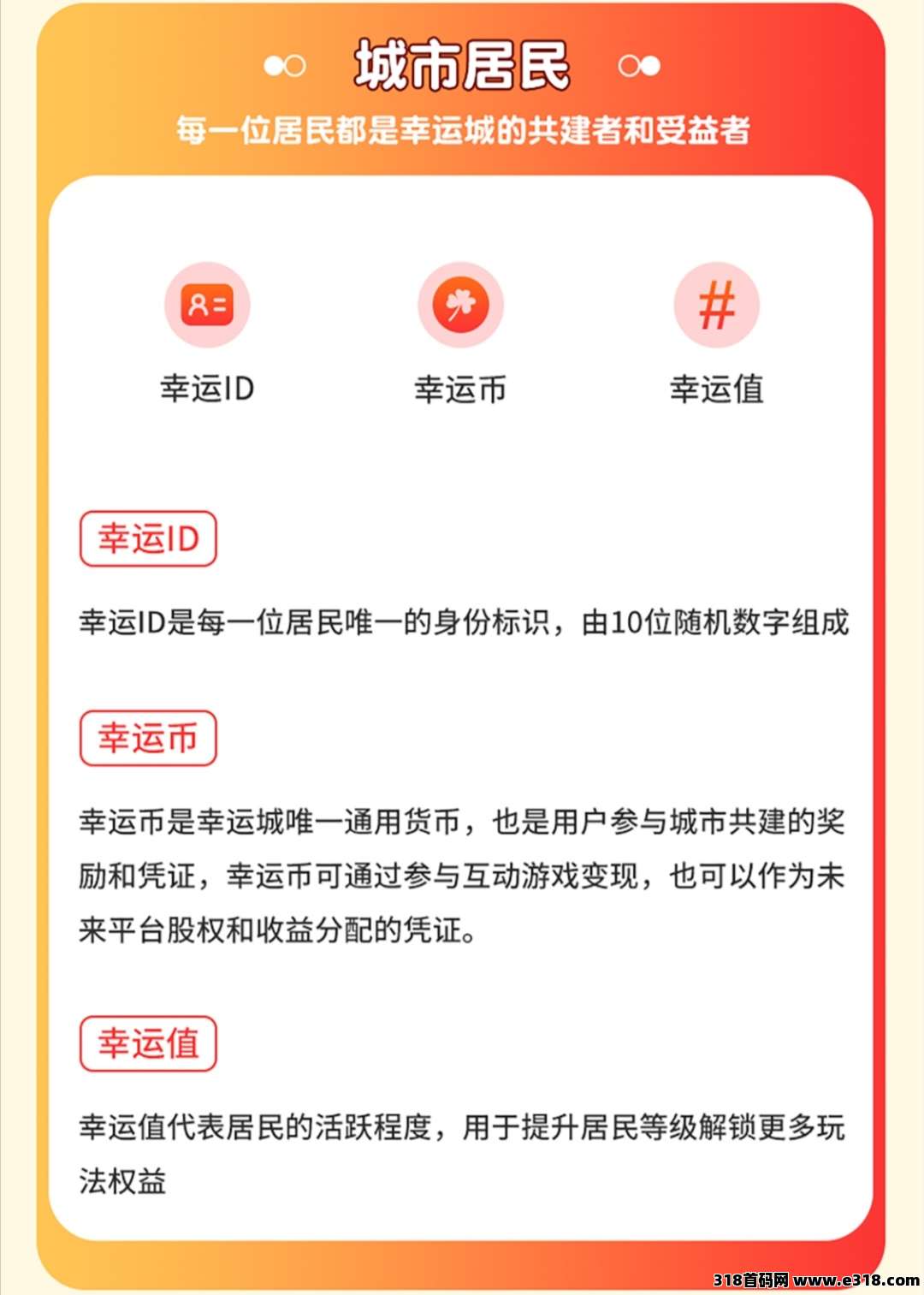 幸运城是一座以“趣味游戏+城市共建+人人收益”为核心的元宇宙虚拟城市,在这里,每一位用户都将成为城市永久居民,通过参与互动游戏,助力城市建设,同时获取幸运币,使用幸运币参与幸运大转盘等互动游戏,获得属于自己的“幸运价值”,体验轻松、有趣、持续成长和收益的数字虚拟世界。