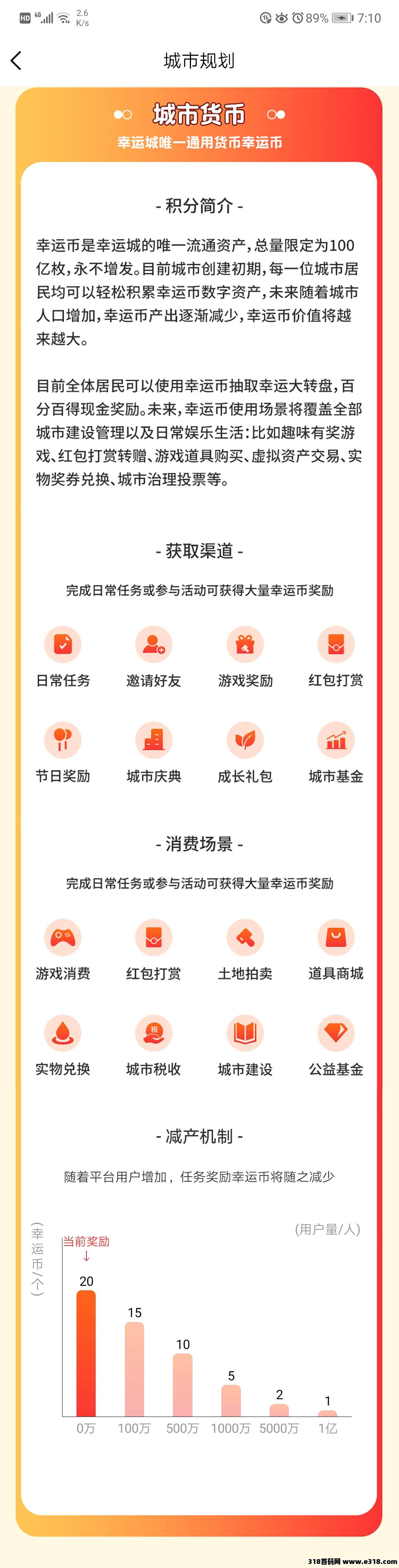 幸运币是幸运城的唯一流通资产,总量限定为100亿枚,永不增发。目前城市创建初期,每一位城市居民均可以轻松积累幸运币数字资产,未来随着城市人口增加,幸运币产出逐渐减少,幸运币价值将越来越大。