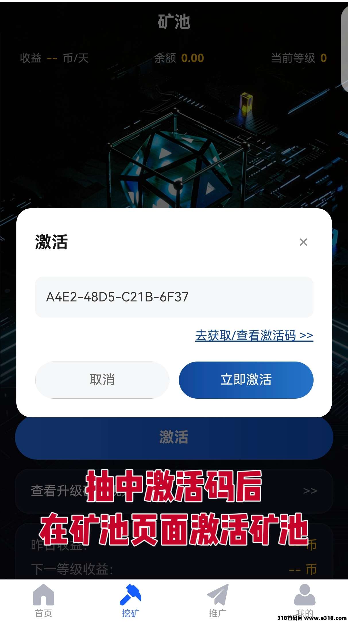 第5步:抽中激活码后,返回矿池页面。激活矿池。次日凌晨3点以后就可以领取收益了。