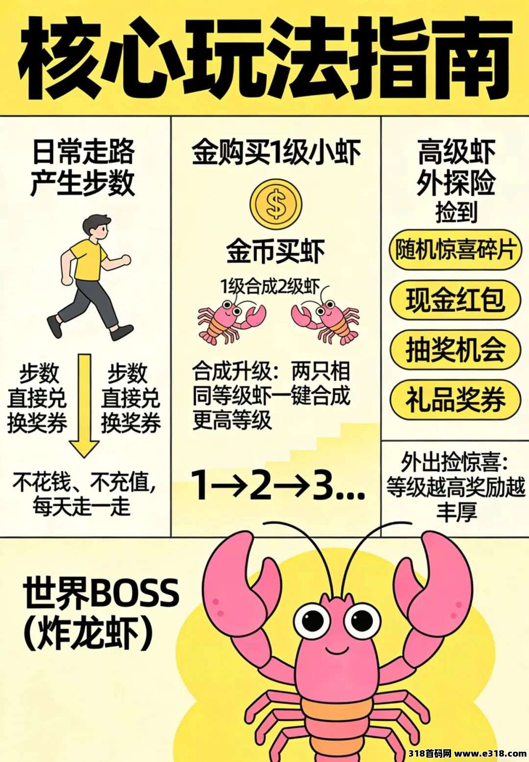 核心逻辑超简单:步数换金币→金币买虾→合成升级→捡红包赚福利,全程零门槛,新手也能快速上手!
