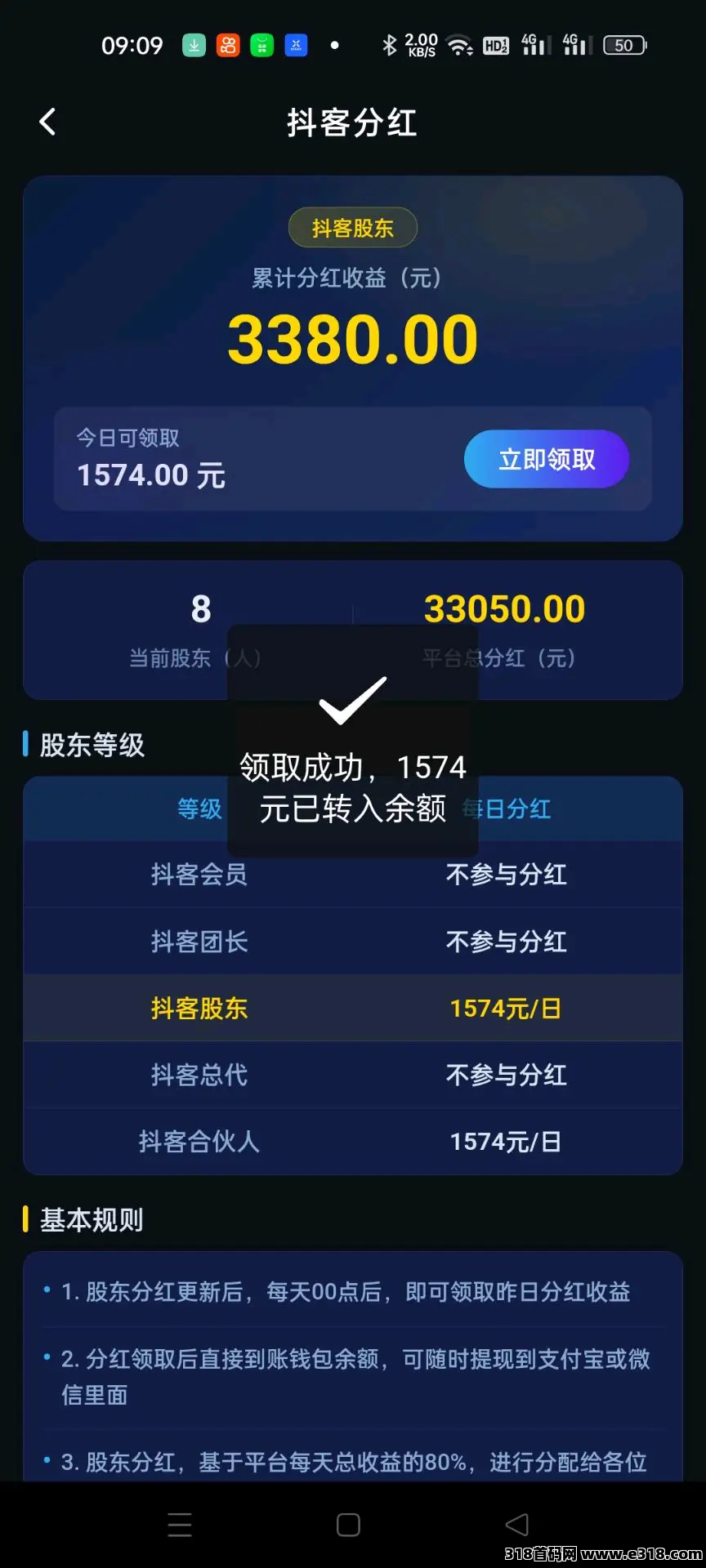 股东**:达到股东级别(直推200个有效托管),可享受平台每日总收入80%的**,收益上不封顶。