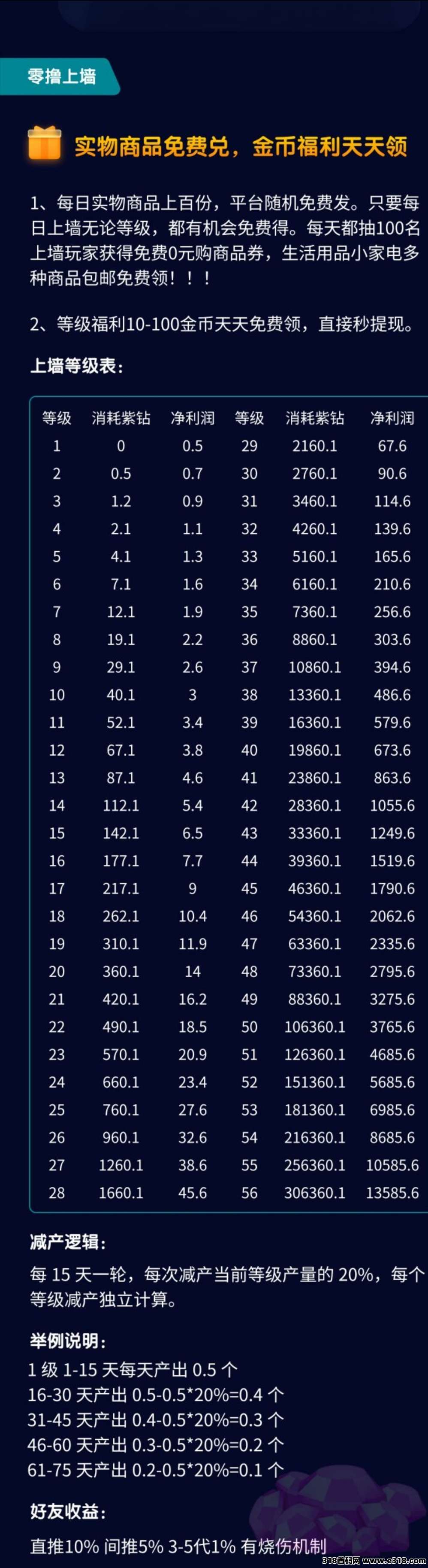②上墙玩法:上墙产出随等级提升,每日产出固定,等级越高收益越高