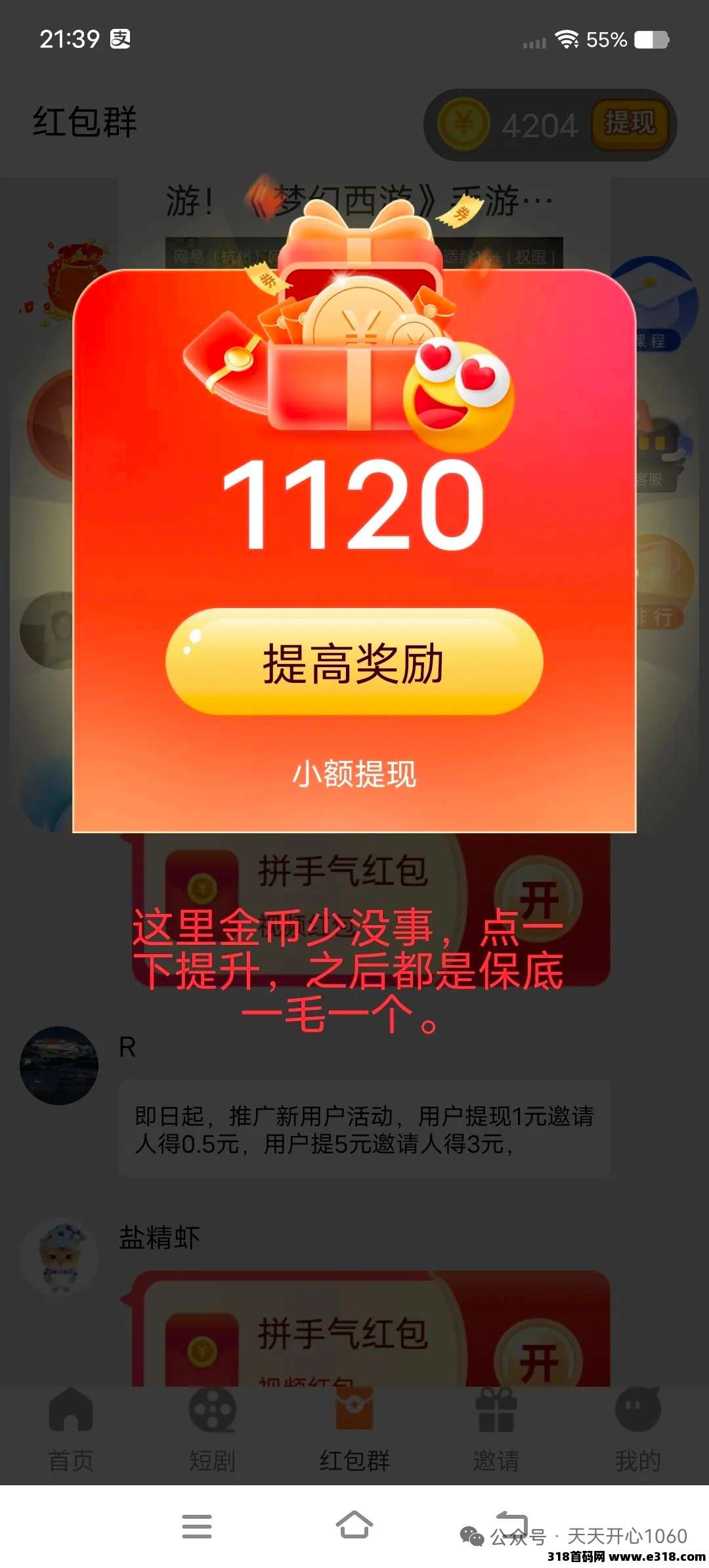 点红包群,金币少的点一下提升,之后都是保底一毛一个了