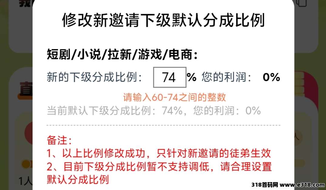设置下级比例不能调低,意味着我在提成里面没有任何收益来源,纯赚个邀请钱,即你成功出单我才能赚个一次性的邀请收益,后续收益我没有一点可以收到