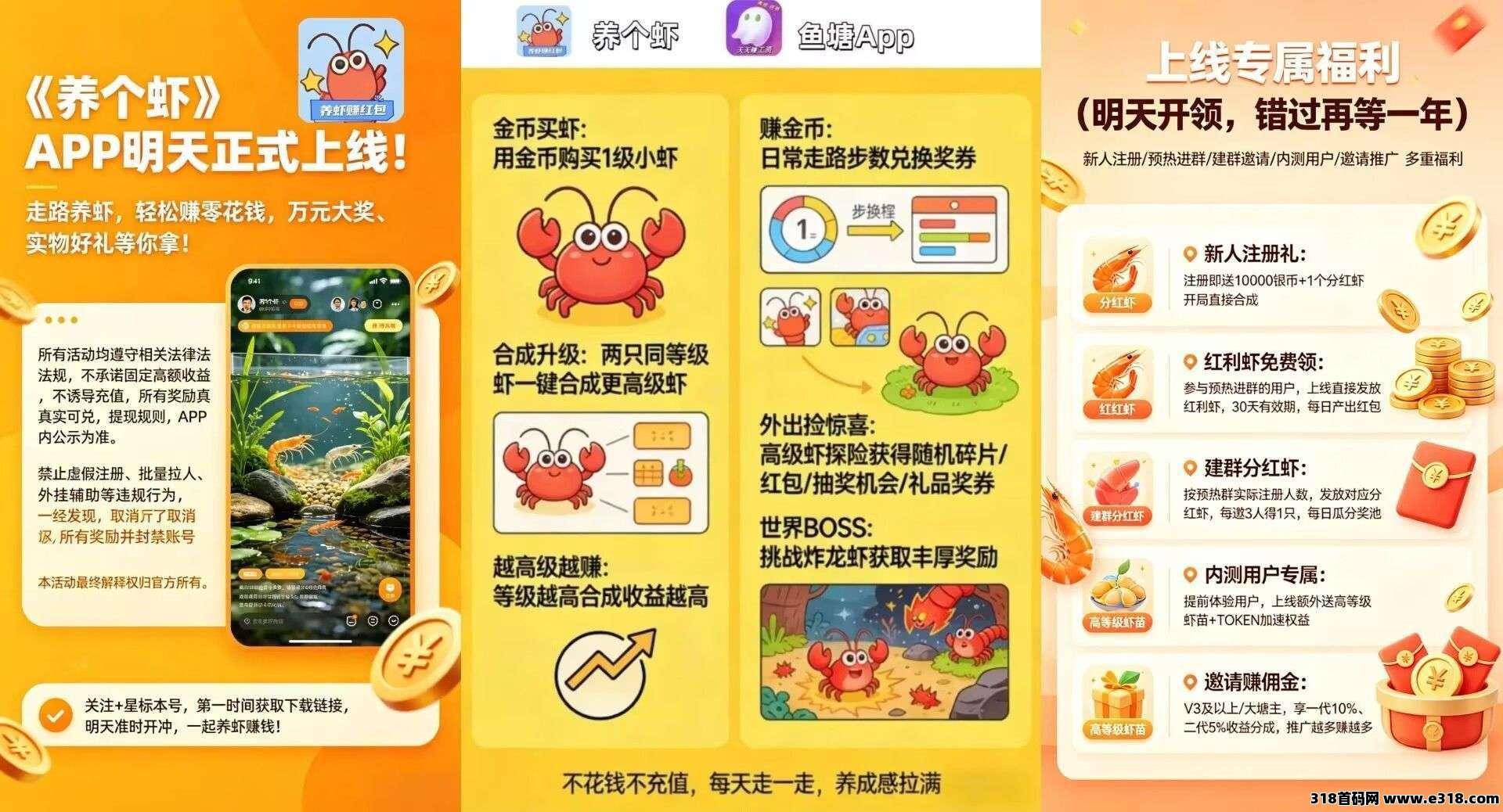 养个虾零撸,鱼塘二台,保底收益搞高,新品上线,简单认证,邀请日入几十米。单独APP,日常走路的步数自动同步到APP里的运动活跃度,里程达标领取虾券,用金币购买1级小虾最高合成38级,看广告可提供产出速率,合成有概率得**虾参与每日大米**,还有解锁地图瓜**包和炸龙虾玩法。