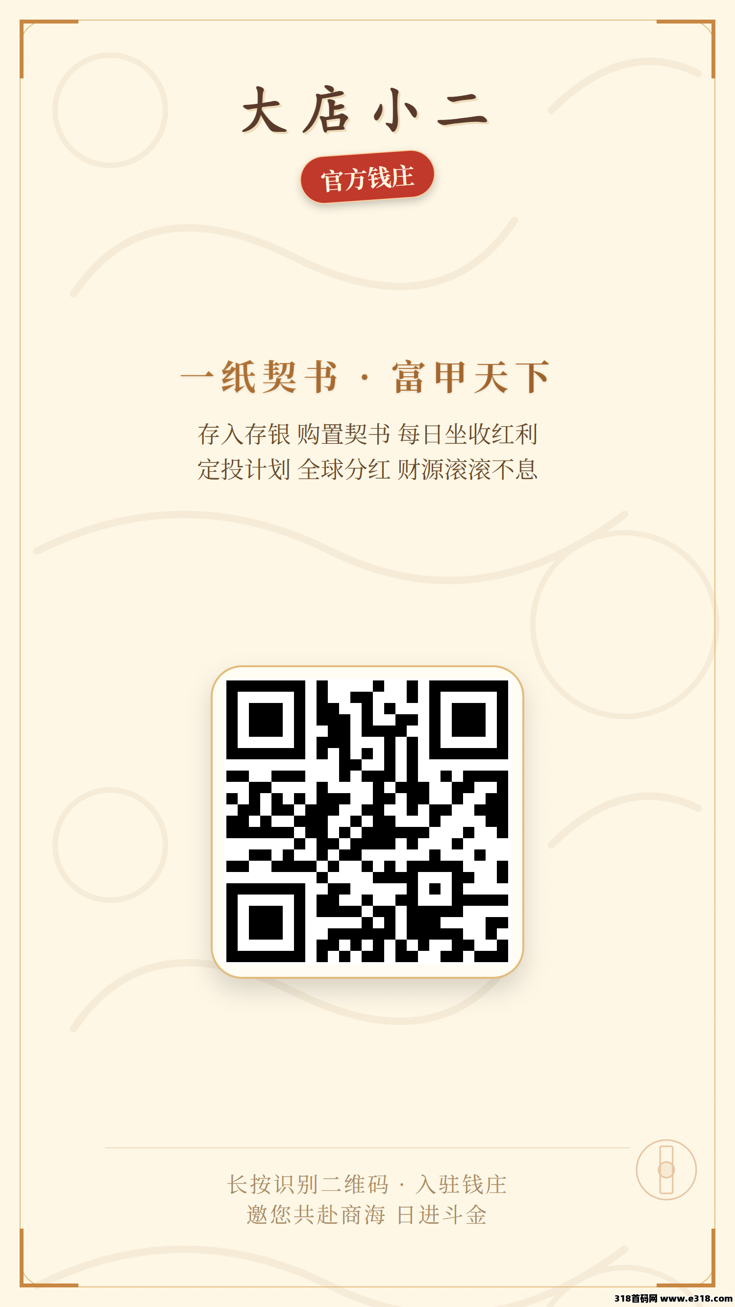 首码内测《大店小二》注册送典当行每天收益10银票,每邀请一人注册得2银票,升级店小二每天分紅40元,升级掌柜每天分紅320元,购置契书每天0点自动收益,定投宝到期出局,零投资推广享受20代佣金,直推购买额外奖励5元,全球分紅,1元起提秒到
