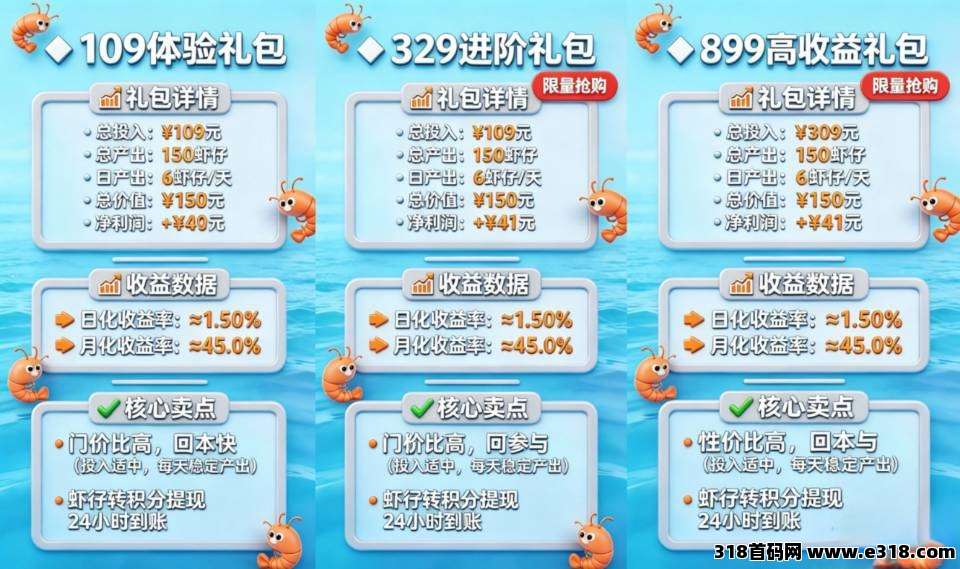 329礼包(每日限量抢)|投入329|产出528虾|周期33天|每日产16虾仔|总收益+199|日*化≈1.8%