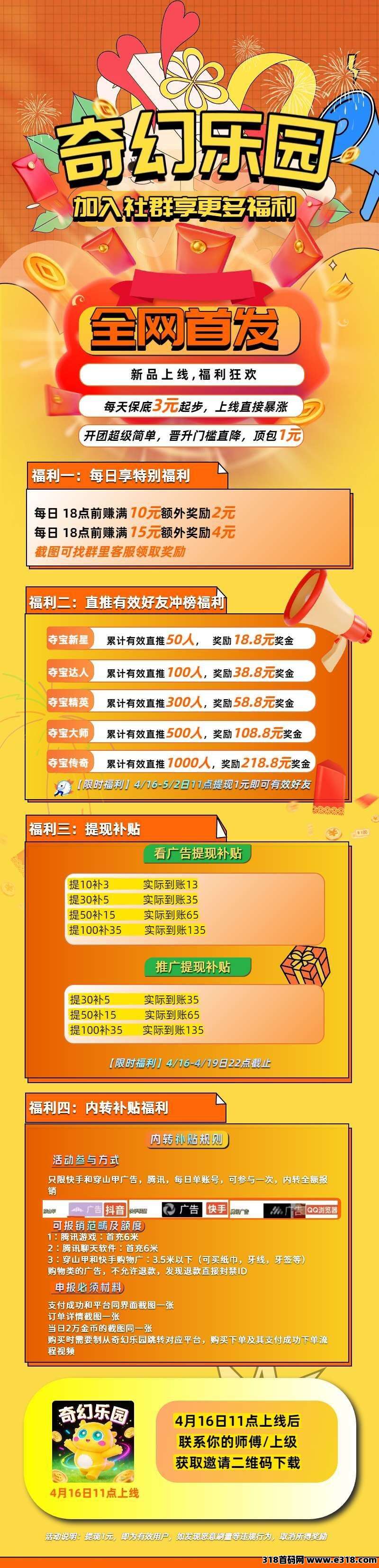 自玩金币扶持 首次预付18.88米~188.88米+后续每次提10米补贴1.66米