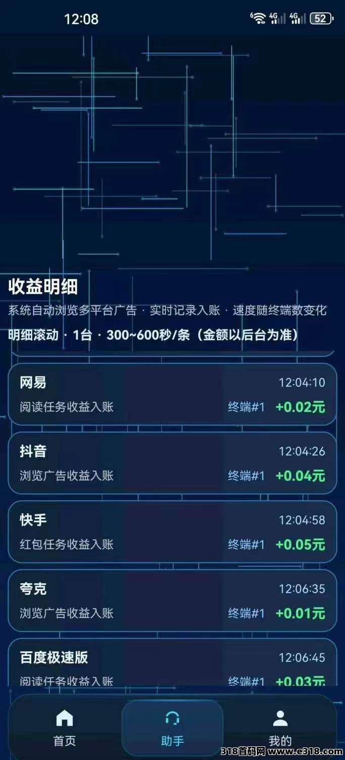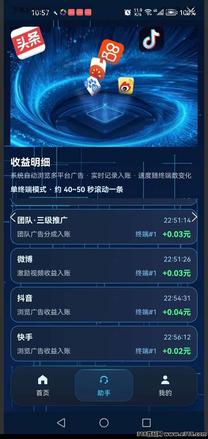 这台机器通过自动刷广告、下载软件跑量等方式全自动赚钱,完全不需要手动操作,放在后台运行就能轻松躺赚,真正释放双手。