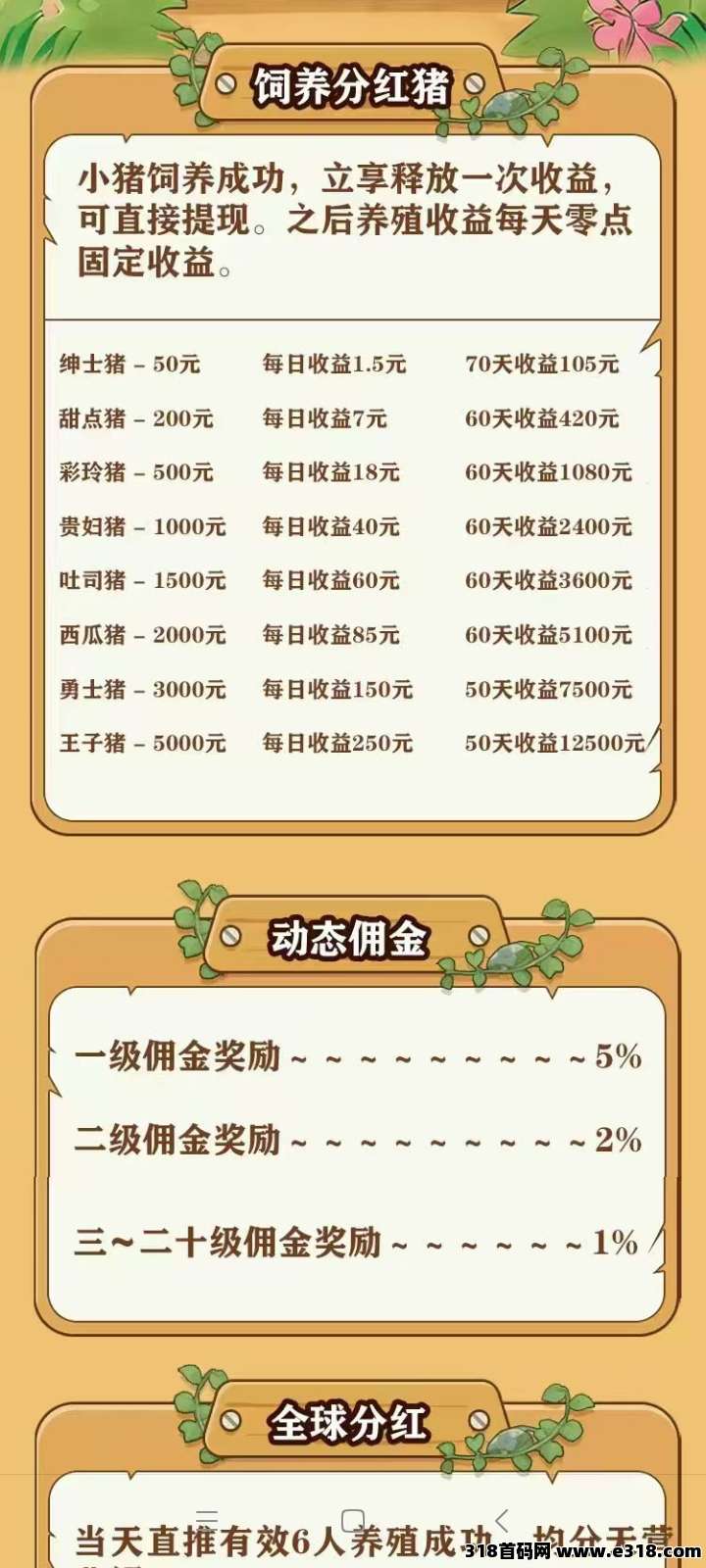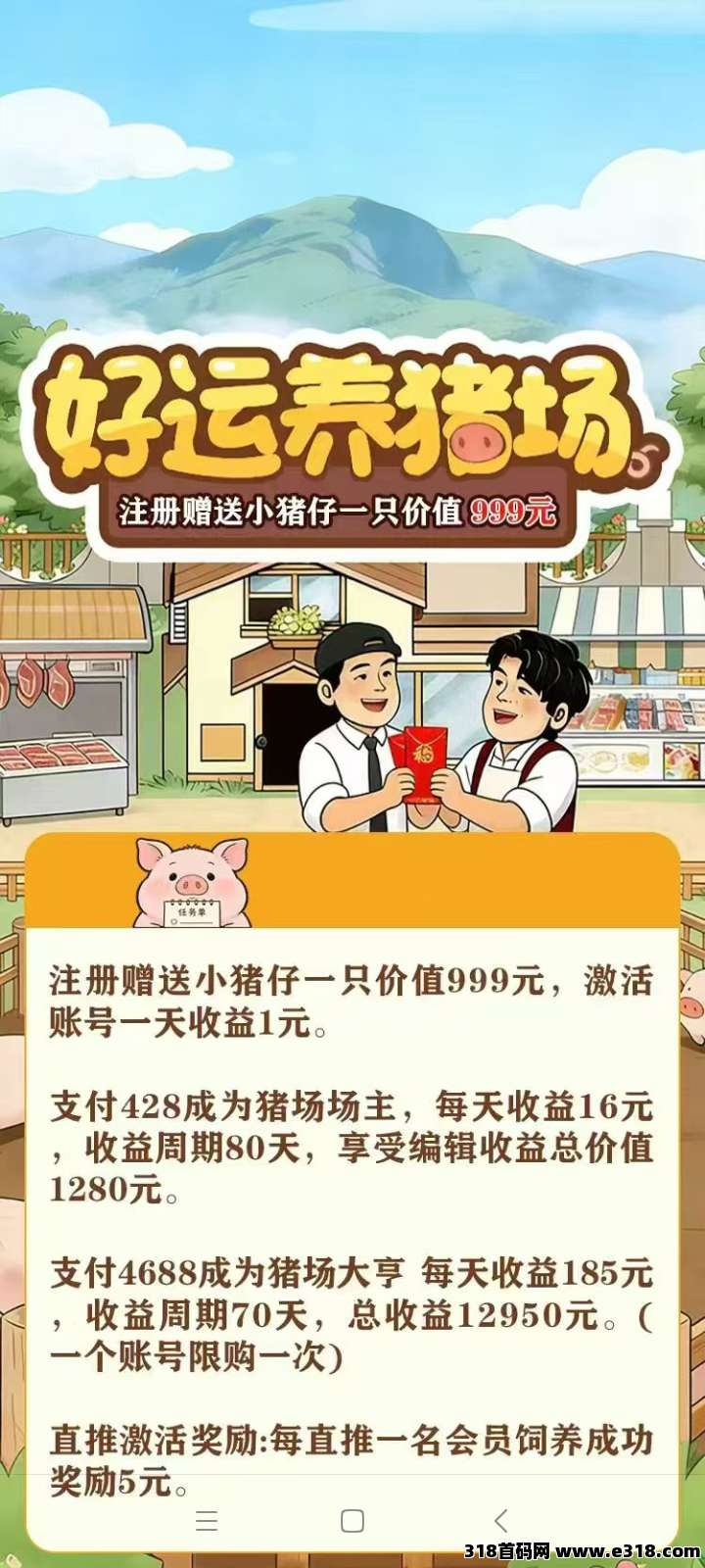 好运养猪场:注册赠送小猪仔一只价值999元的小猪,每天都会有产出,成为猪场场主,每天有固定160元的管理补贴,邀请好友养成功养猪奖励75元+养猪分成,不设置天花板,非常容易挣到钱。