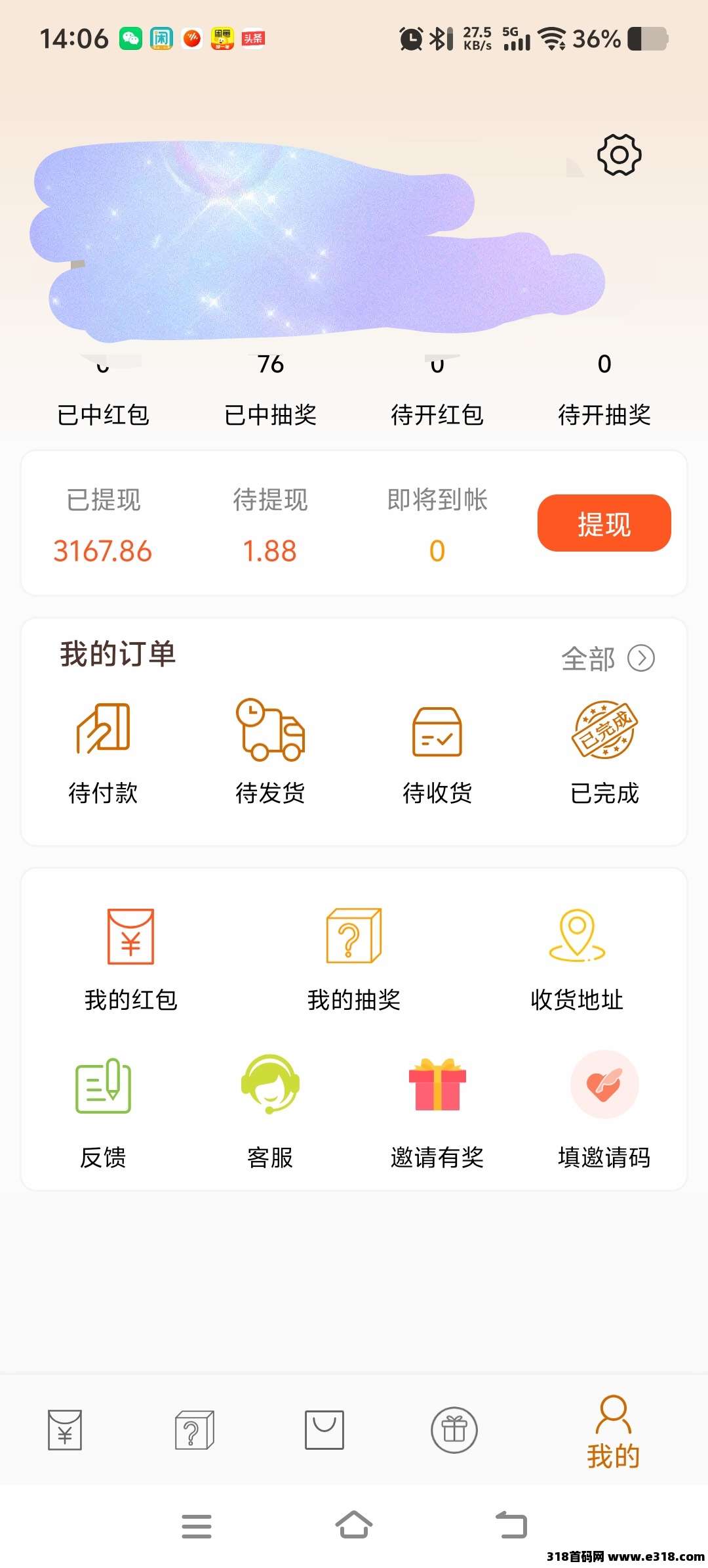 累计已提现3167.86元,当前待提现余额1.88元,同时附带购物返利、订单管理功能。