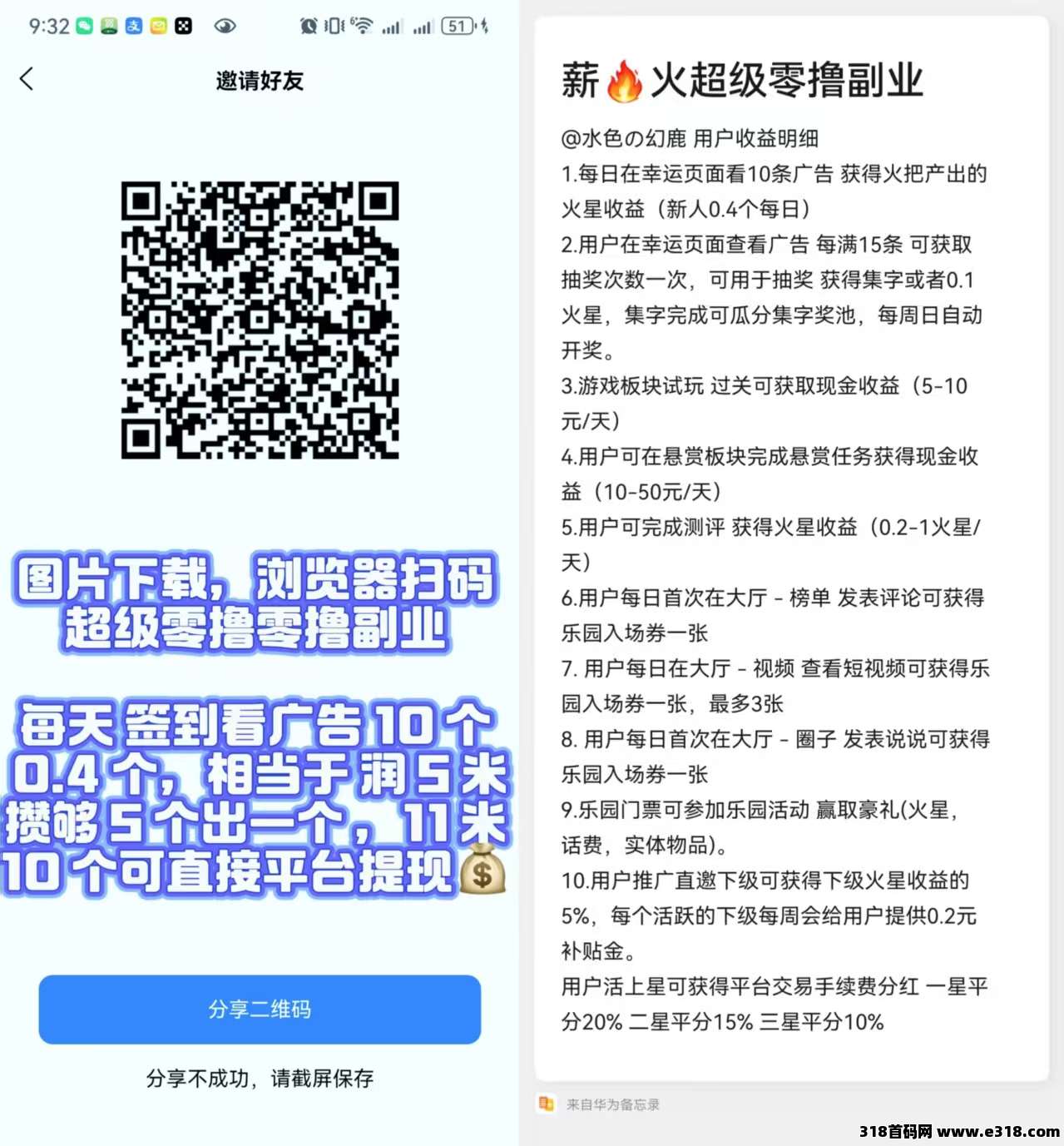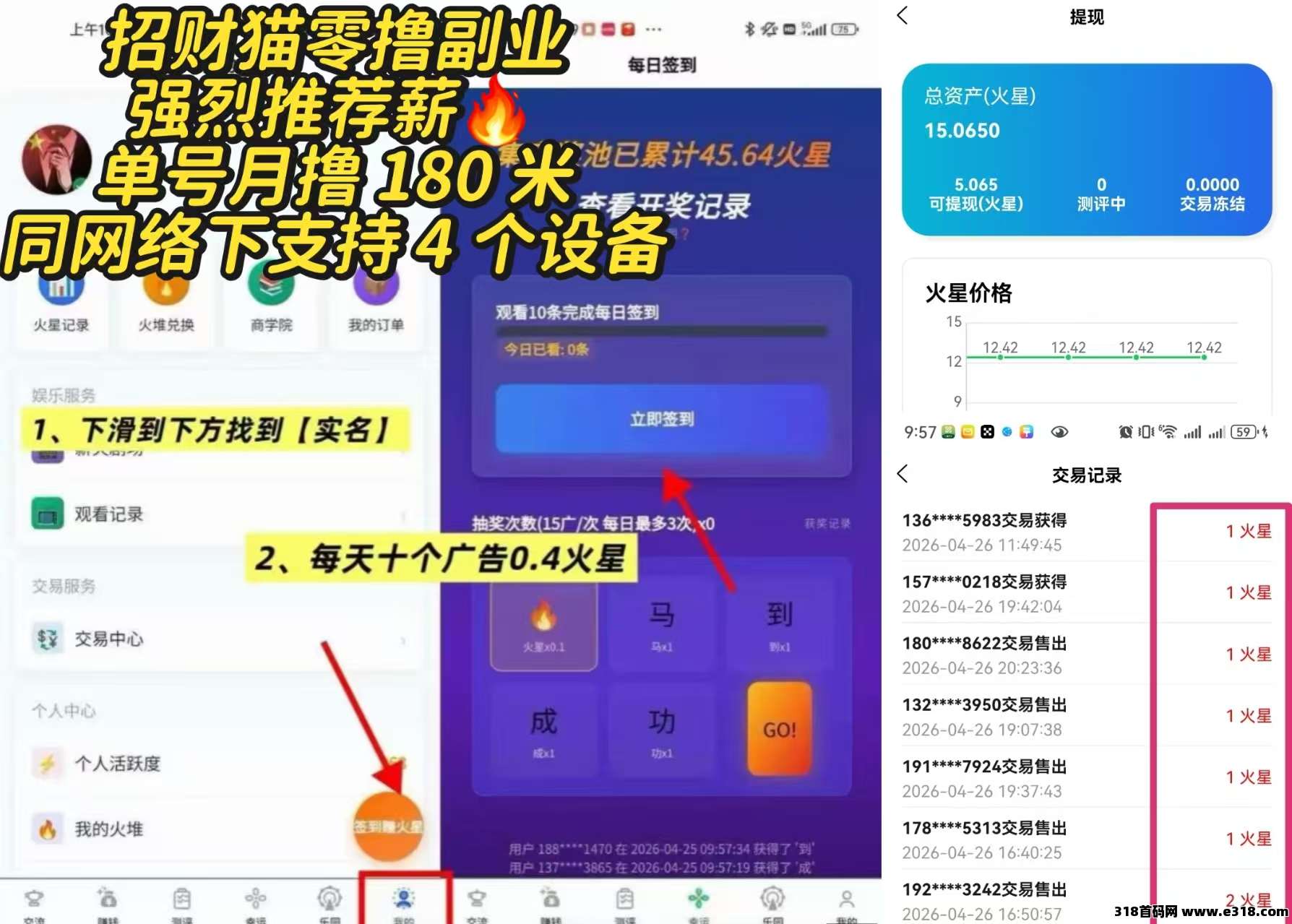 玩法:注册实名然后首页看10个广告得0.4火星价值5元,新用户满5个可以试卖一个,10个以上提现不限制,新用户复投后5个以上部分都可以卖。