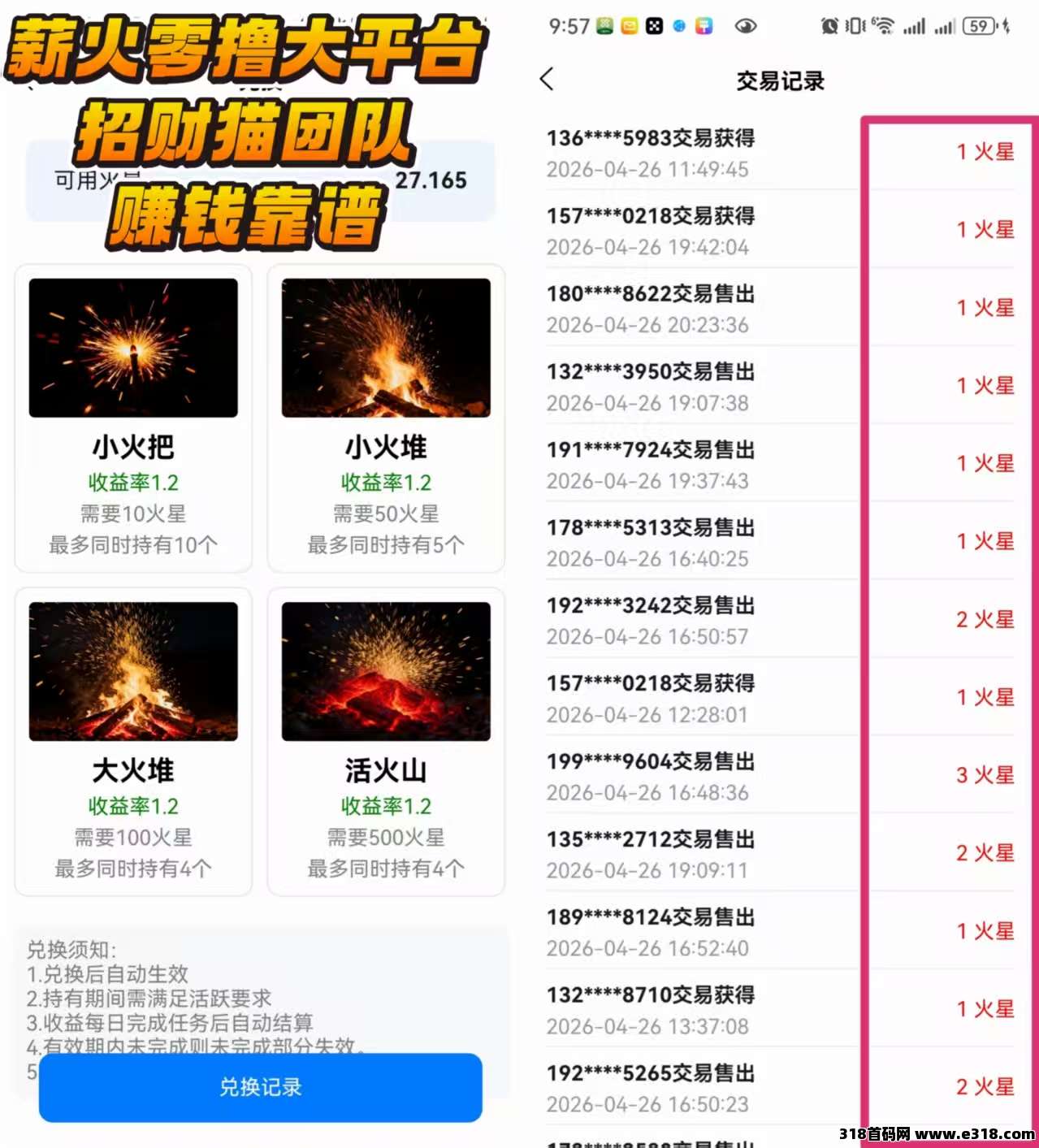 4、之后我们再攒10个去复投一次购买这个小火把,然后这个小伙把我们可以卖产出12个里面的7个,有个几十块钱。满5个以上就能直接去交易市场出售满10个以上可以去平台提现 【一个网络下支持4个设备】