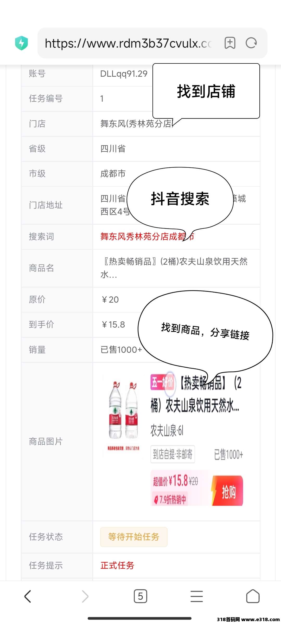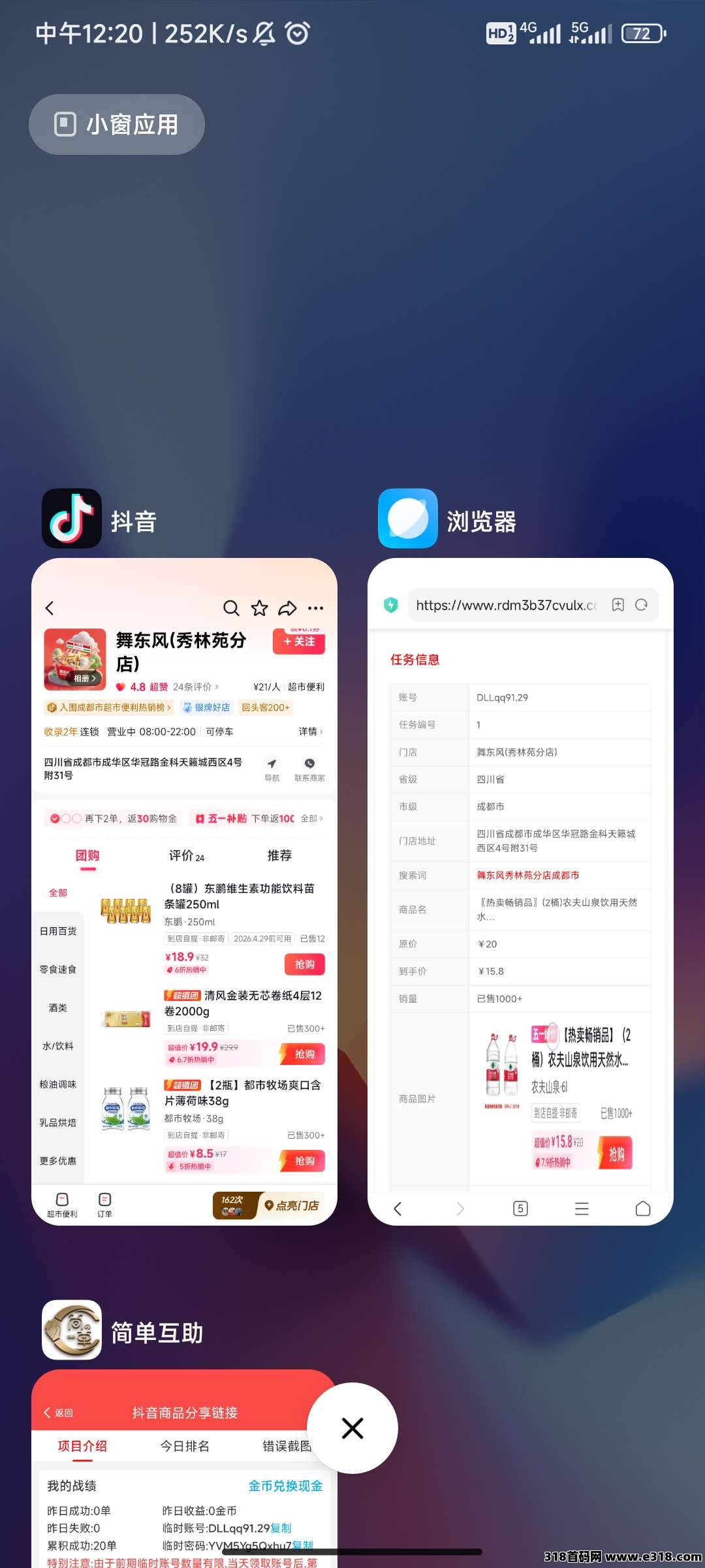项目介绍:领取临时账号,登录任务做单系统,领取抖音商品分享链接任务;然后进入抖音去搜索店铺并进入,在店铺里找到对应商品并获取分享的链接,最后回到系统提交.