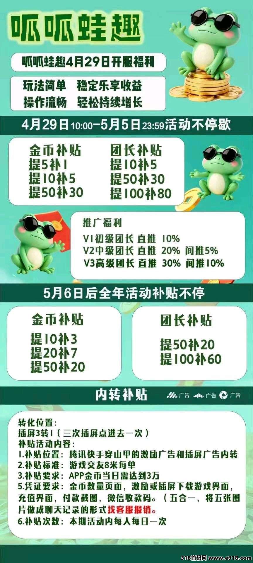(呱呱蛙趣)零撸卦机广告赚,新品上线,保底收益,放水中,自动涨金币