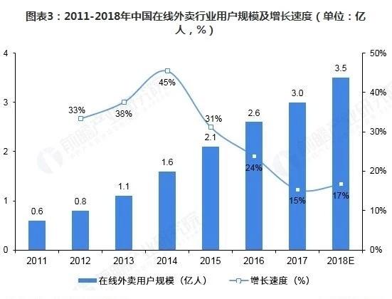 在快节奏的城市生活里,外卖渐渐成为了生活的“必需品”。现在的外卖不仅仅是提供送餐服务,还可以满足消费者生活方方面面的需求。近几年来,在线外卖市场规模迅速扩大,保持两位数增长,2017年超过2000亿,达到2046亿元,同比增长23.1%。用户规模与其保持一致,2017年在线外卖用户规模达到3亿人,较2016年增长15%,预计2018年将增长至3.5亿人。经过前期市场的高速增长,目前我国的外卖行业已经步入稳定发展期。随着外卖订餐习惯的潜移默化,快餐外卖O2O市场对于餐饮市场的渗透率也会逐渐达到80%以上。