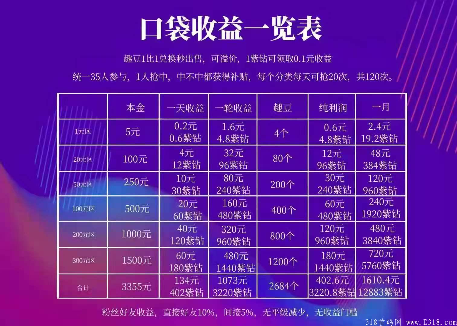 按100元商品来算,只需要500本金循环使用,拼到5个大概需要拼175次,大概需要8到9天,按8天来算,每次拼团获得1元,每天获得20元,8天获得160元,每次拼团获得3个紫钻,每天60个,8天获得480紫钻(可兑换48元左右),400趣豆卖掉400块,总收益:400元(趣豆)+160元(收益)+48元(紫钻)-500元(产品本金)=8天赚了60元佣金+48元的紫钻+一件商品