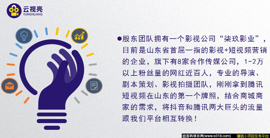 云视亮APP - 电商购物短视频平台,5G短视频+直播+区域链模式,平台实力强劲。项目收益有直播打赏、交易手续、流量增益、广告业务、网红带货、电商购物等。