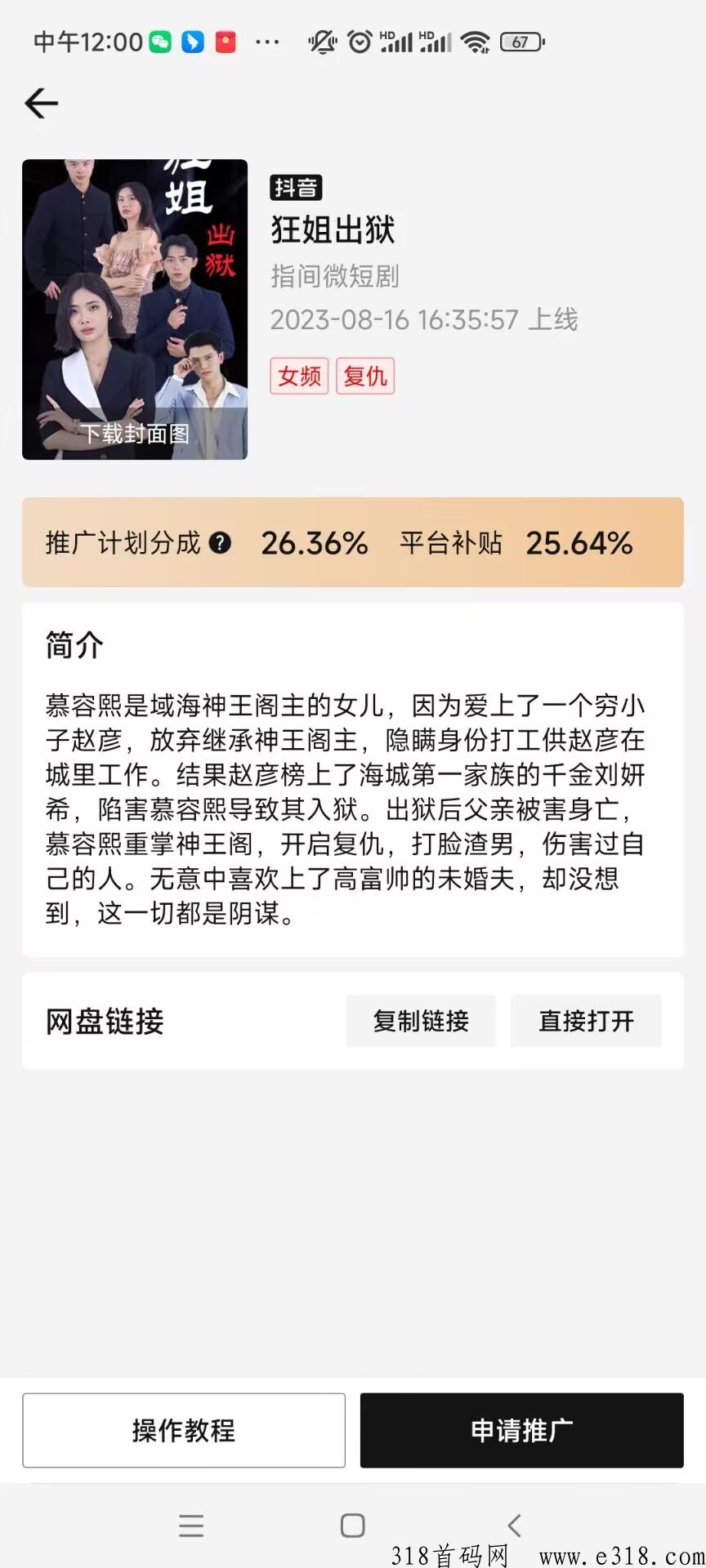 我们经常在短视频平台刷到一些精彩短剧,这些短剧一般是由网络小说改版拍成短剧,一集1-3分钟,剧情紧凑吸人。而剧里剧外官方拿到了这些剧方的授权和视频素材,您只要从剧里剧外app下载短剧素材,进行二次剪辑后,发布到抖音,快手,视频号平台,发布时挂载小程序,用户刷到视频看到兴趣点时,就会点击下方链接进入观看,当看到精彩剧情时,需要进去充值或者观看广告,才能解锁下一集继续观看,只要用户完成了充值或者观看了广告,即可获取收益,您也可以邀请好友一起来做这个项目,没有粉丝限制,也可快速获取流量进行变现。