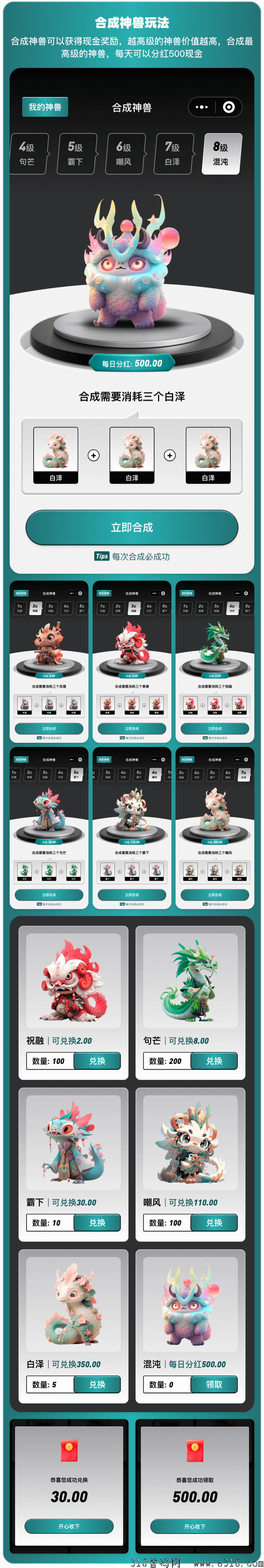 4、神兽系统,合成一定等级神兽,可以兑换红苞,合成最高级**神兽,每天可以**领500块。