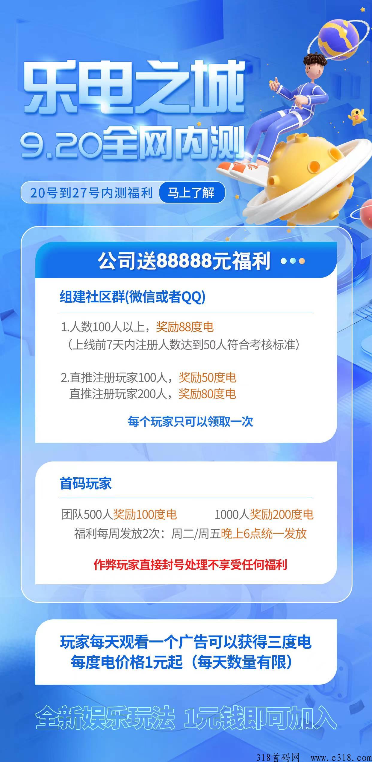 乐电之城,娱乐玩法。每天看20秒广告可以免费赚米。也可以投米赚钱。实名注册成功团队等级,随时激活享受团队收益。娱乐玩法门槛超低,上手简单。全网销毁机制最高的项目。9月20号全网内测,上线当天群里有红包。