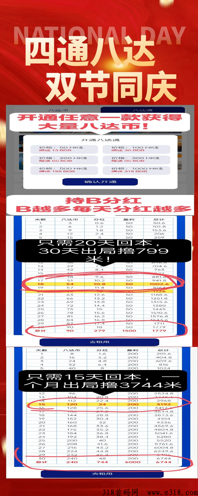 你不用看懂这个表!你只要知道充50块,签到30天9枚,注册2枚,大一统3枚,开卡送13枚总计27枚八达b,按今天分h0.3来算,9天就回了,一个月本金翻4倍,而且你的八达通余额还能去抢一瓶油或者一袋大米!