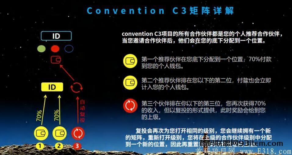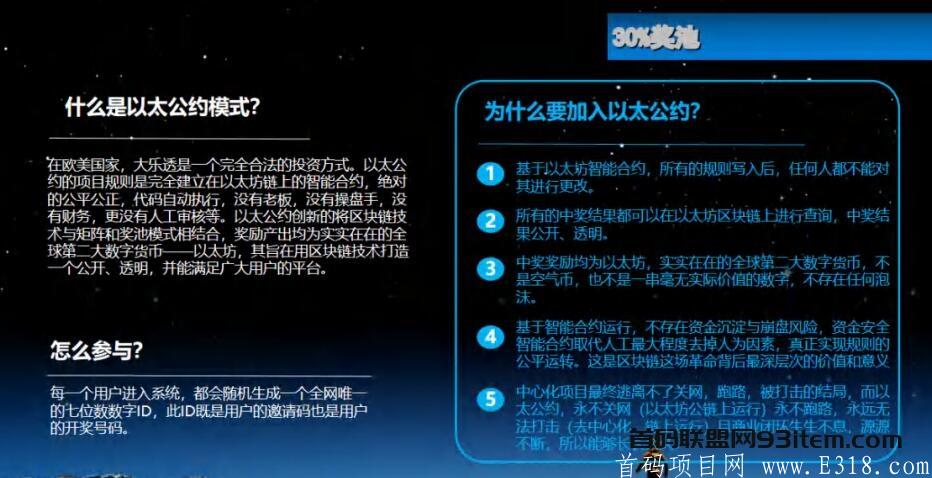 每位新用户通过邀请链接进入系统,根据职能**自动识别,会随机生成一个唯一的数字ID,ID就是邀请码,也是用户的中奖号码,全网入金总额30%进入乐透区,全民奖15%,超级奖8%,以太公约奖3%,调用**手续费3%,公平公正,代码自动执行,完全去中心化,永不跑路,永不断网。