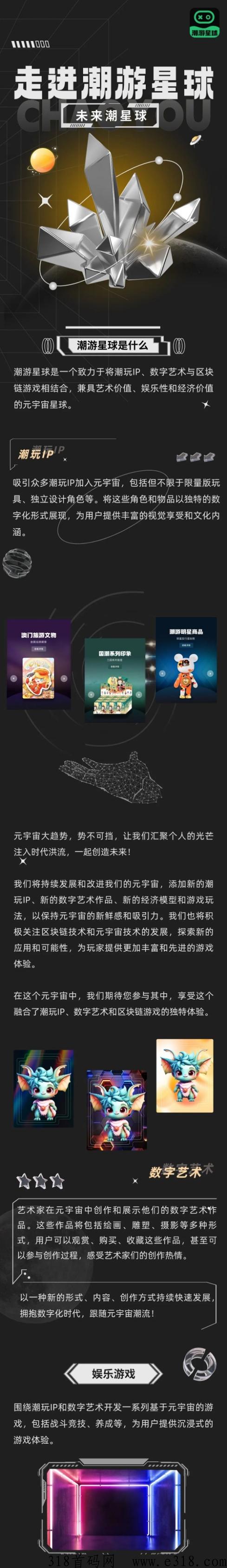潮游星球是一个致力于将潮玩 IP ,字艺术与区块游戏相结合,兼具艺术价值、娱乐性和经济价值的元宇宙星球。