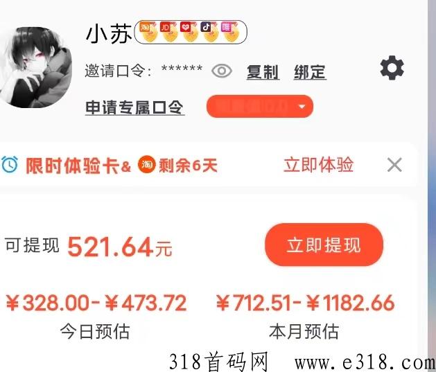 手机应用商店下载“店流宝”邀请码5688登录,首页“我的”界面选择“加盟体验卡”,开通体验店,也可以享有分享提成。体验卡推广一级顾客可提成25%,推广二级顾客可提成20%,相当于,单店只需要推广4个一级顾客体验加盟,便可免费开店,拆包全是纯收益。