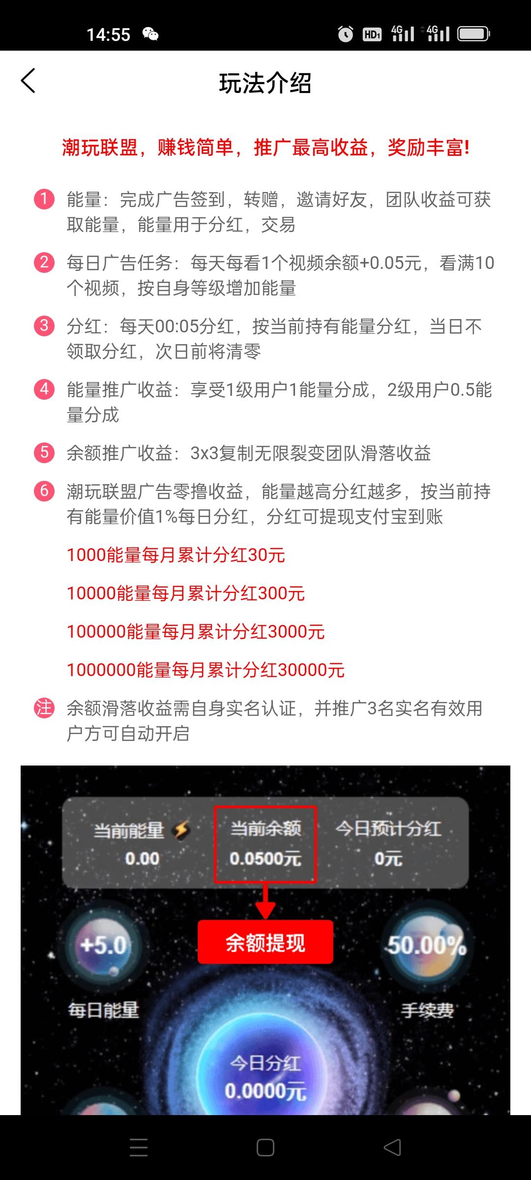 ①:每天看10广告0.5元到余额,分享3人享受8.8万人团队滑落每人每日0.15元收益,一元起提。