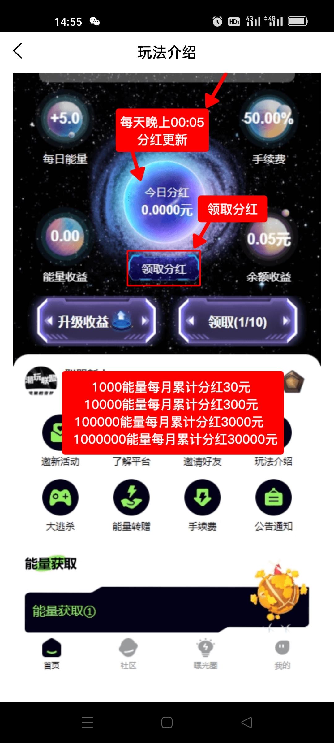 ②:看10广告同时+5能量,1能量价值0.1元~1元,内置转赠交易,升级每日能量收益,能量每天**至余额。例如: