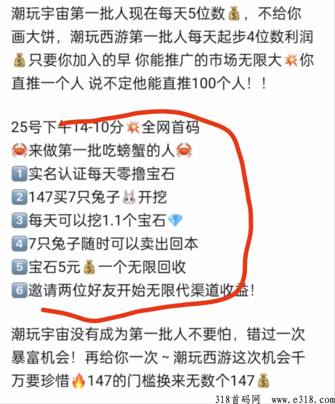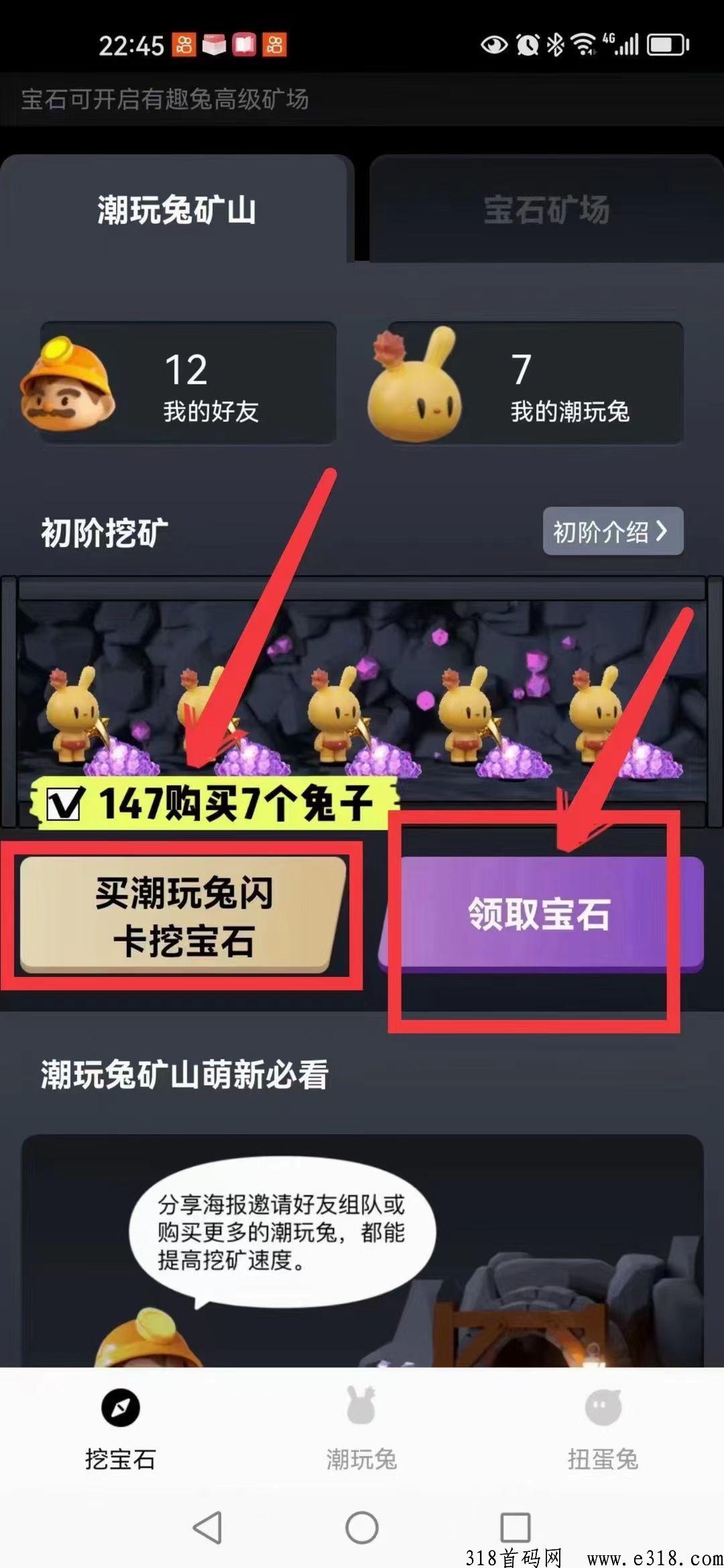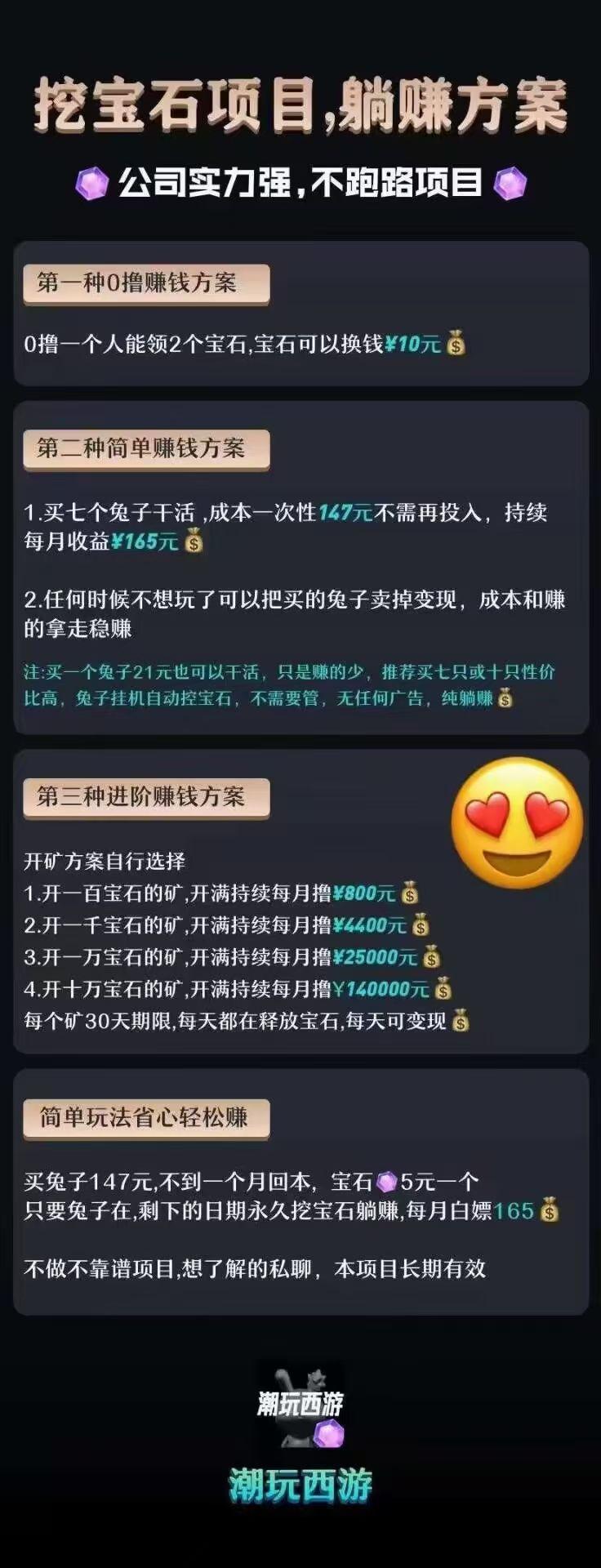 玩法介绍:一人一号,永久挖,147等于7只兔子,每天自动挖1.1宝石。官方兜底5元,不到一个月回本,进群了解