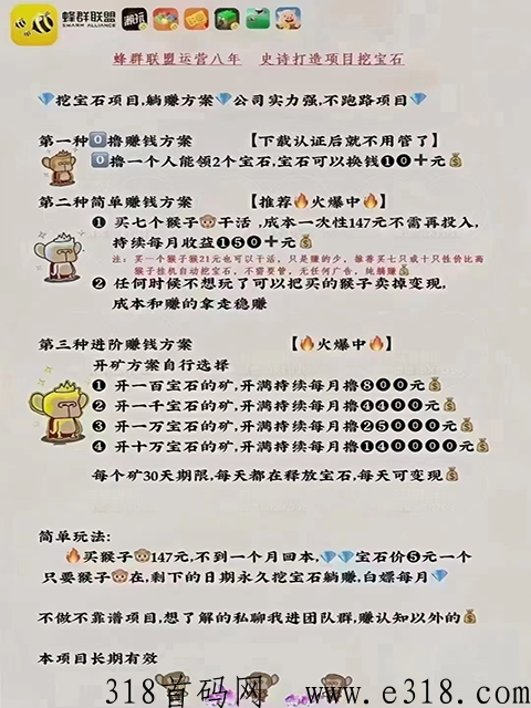 两种方式管道收益:几个月前听我入场的家人,赚麻了!第一种、实名认证,新人注册免费收益一月或本金147,猴卡即将涨价喽,一月回本,购7张无猿猴自动收入宝石,随时变现;几个月前2元多一个宝石,因太火爆,现已疯狂上涨7元多一个宝石,你细品!跟上节奏,赚钱就跟呼吸一样!!第二种、无需本金,扭兔单,靠每天免费开蛋升级战力自动收入宝石,随时变现。注册好后暂时不升级,因升级需要消耗7个猴子!!!