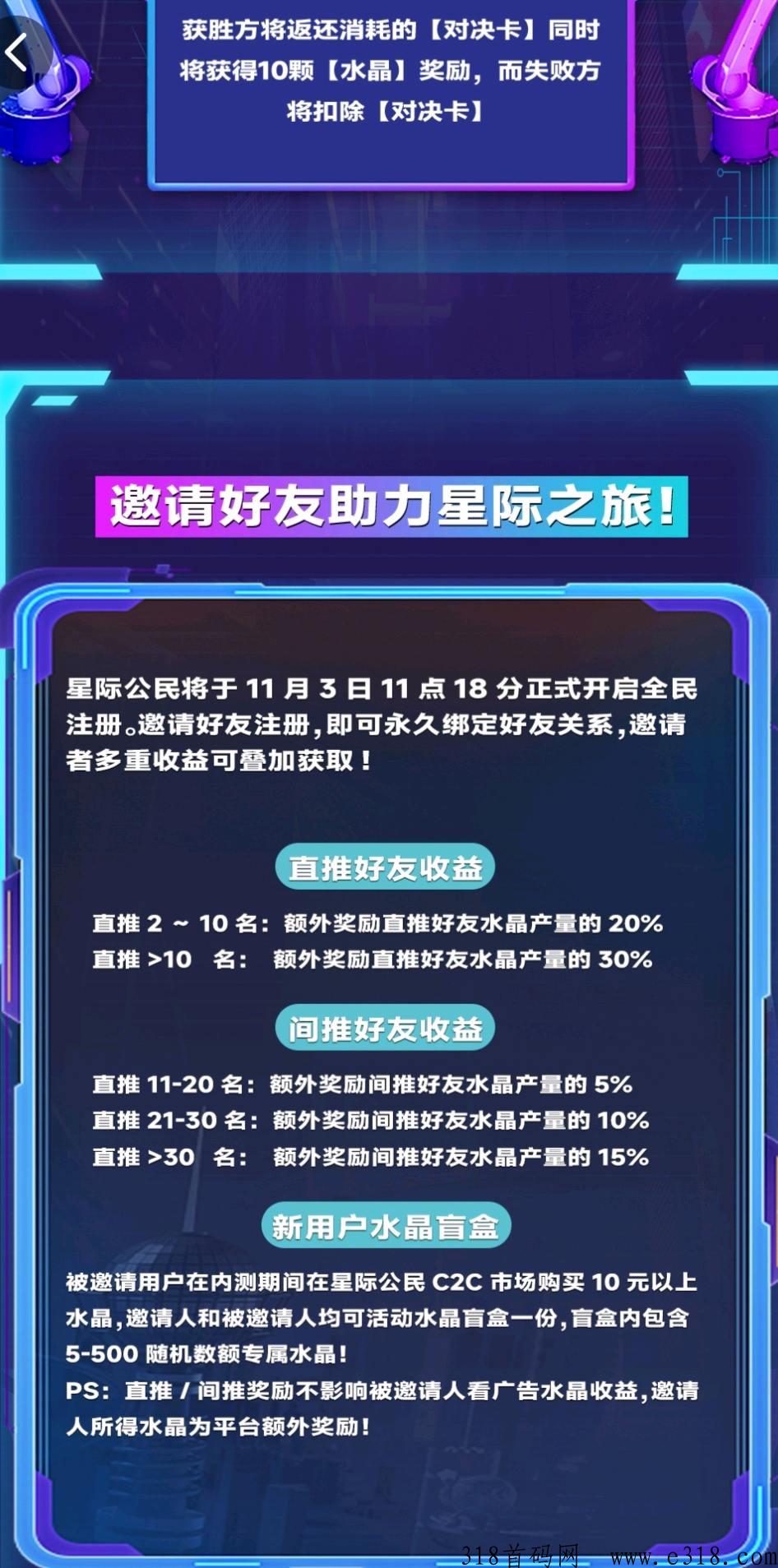 - 内测期间被邀请用户购买10元水晶,邀请人和被邀请人都可获得活动盲盒*1,内含5~500随机数额专属水晶