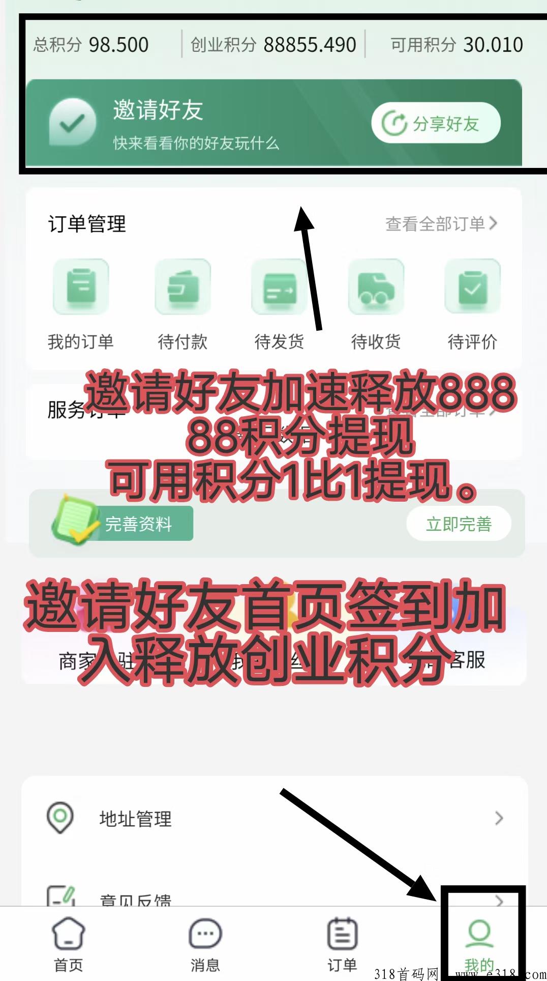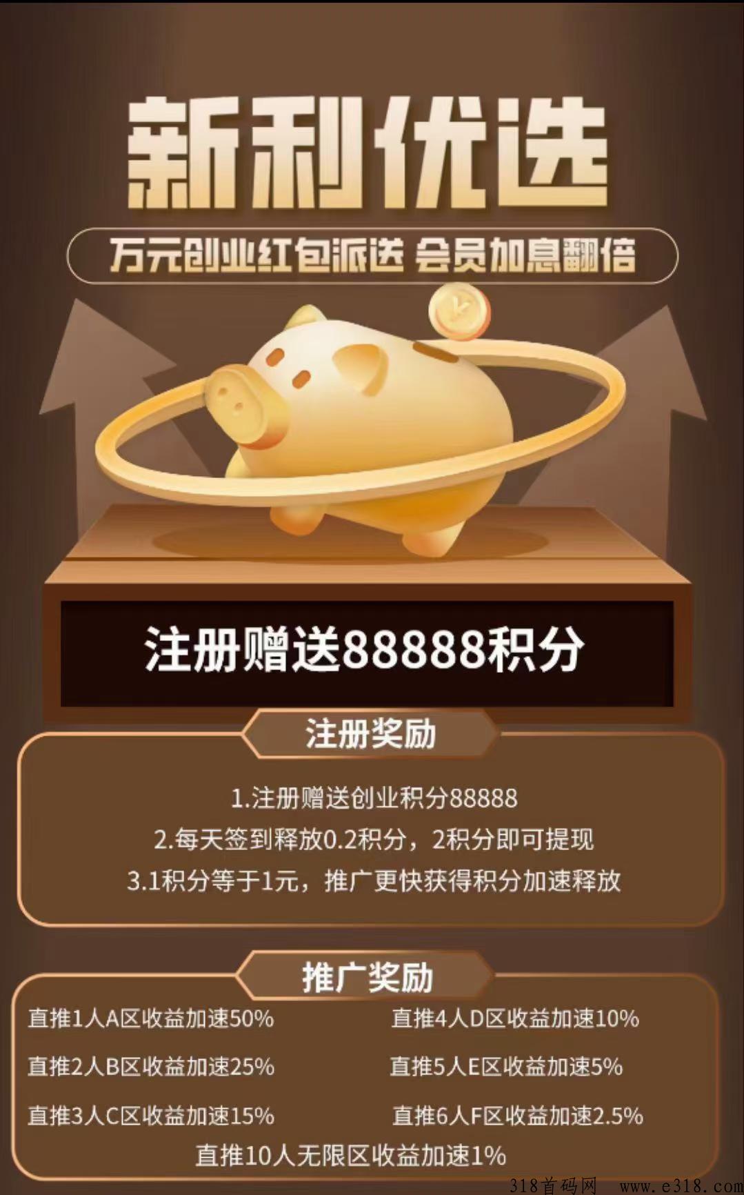新利优选首码,零撸注册送创业88888积分,积分1比1提现,每天签到释放,邀请好友加速释放创业积分,无限团队收益