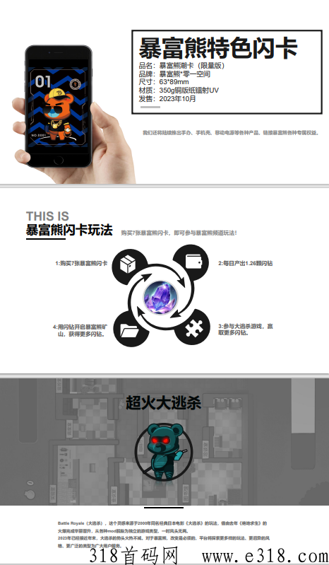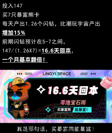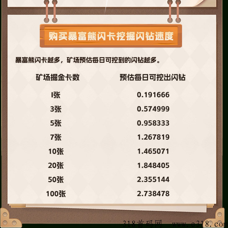 买入七张暴富熊卡,获得七张闪卡,推荐7张闪卡上车。不看广告,不做任务,自动**,一天1.26个闪钻,一个月37.8个。(产量高于同类型15%)