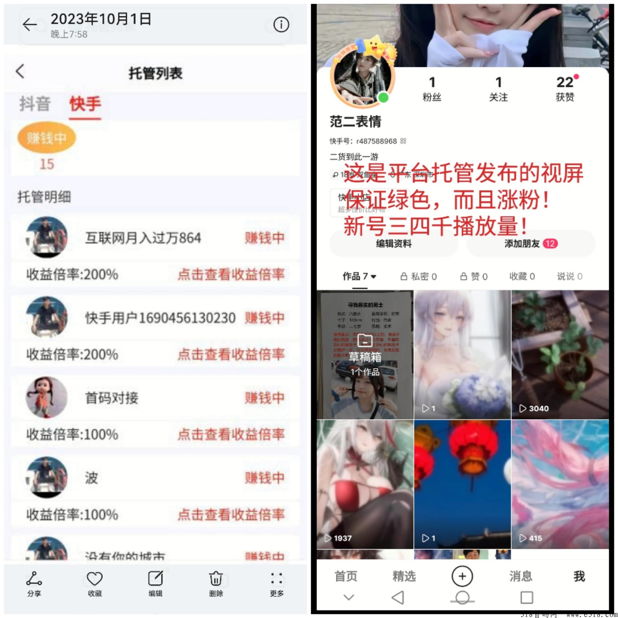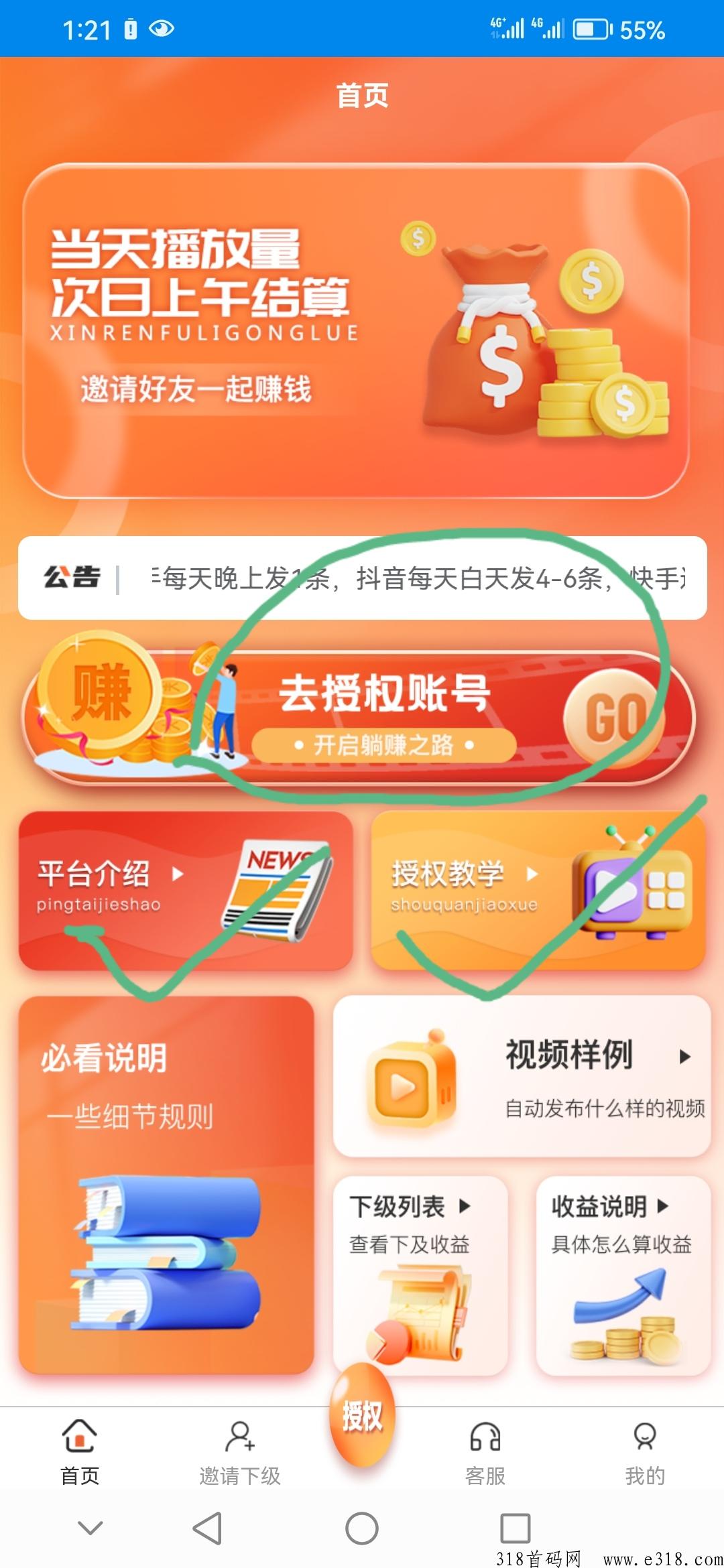 首码《播放赚》最靠谱的网赚项目,全程零投资,有抖音就能赚钱,不用实名认证,绿色正规短视频代运营平台,长久稳定,不用自己任何操作,只需要简单授权即可每天坐等收益到账,不用自己编辑或发布视频。授权成功后,平台每天制作视频,往你的抖音或快手发布,都是一些表情类视频,按播放量计算收益,有播放量就有收益,视频播放量每天叠加,一个视频火了就有几十收益,账号可无限托管,账号越多收益越高。满一元提现,秒到账,当天托管成功隔天中午12点前就能看到收益,推广得下级百分之百托管提成,下级托管收益多少,你到账多少,妥妥的零撸躺赚好项目,授权方法:点击去授权账号,选择要托管的账号,保存获取后的二维码到相册,然后用抖音或快手扫保存的二维码就授权成功。就能开始躺赚之旅!播放赚app用微信扫码下载。