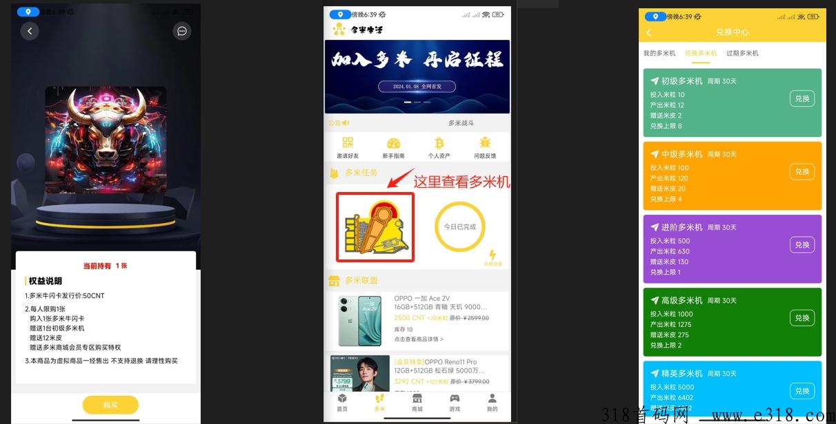 获取多米机的途径有两个 第一种是通过购买平台的多米闪卡 一张闪卡50CNT 平台会赠送一台多米机 ,第二种是通过市场收购米粒兑换多米机。