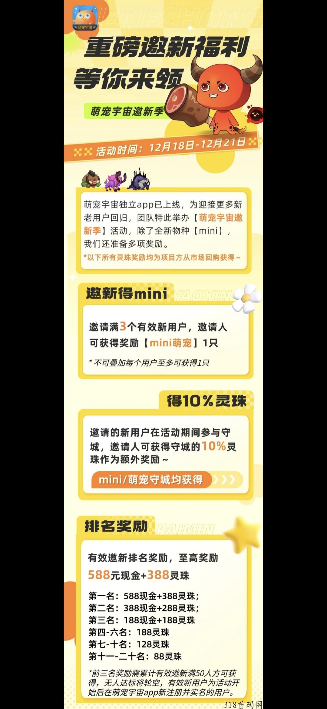 一、免费实铭送萌宠一只,自获得时间起计算;21天后,mini萌宠将自动销毁,在12月18日12点-12月21日24点期间,方法二:成功邀请满3个有效新用户,可获得1只,活动结束次日发放至仓库;注:每人在活动时间内最多可通过以上2种方式各获得1只mini萌宠。
