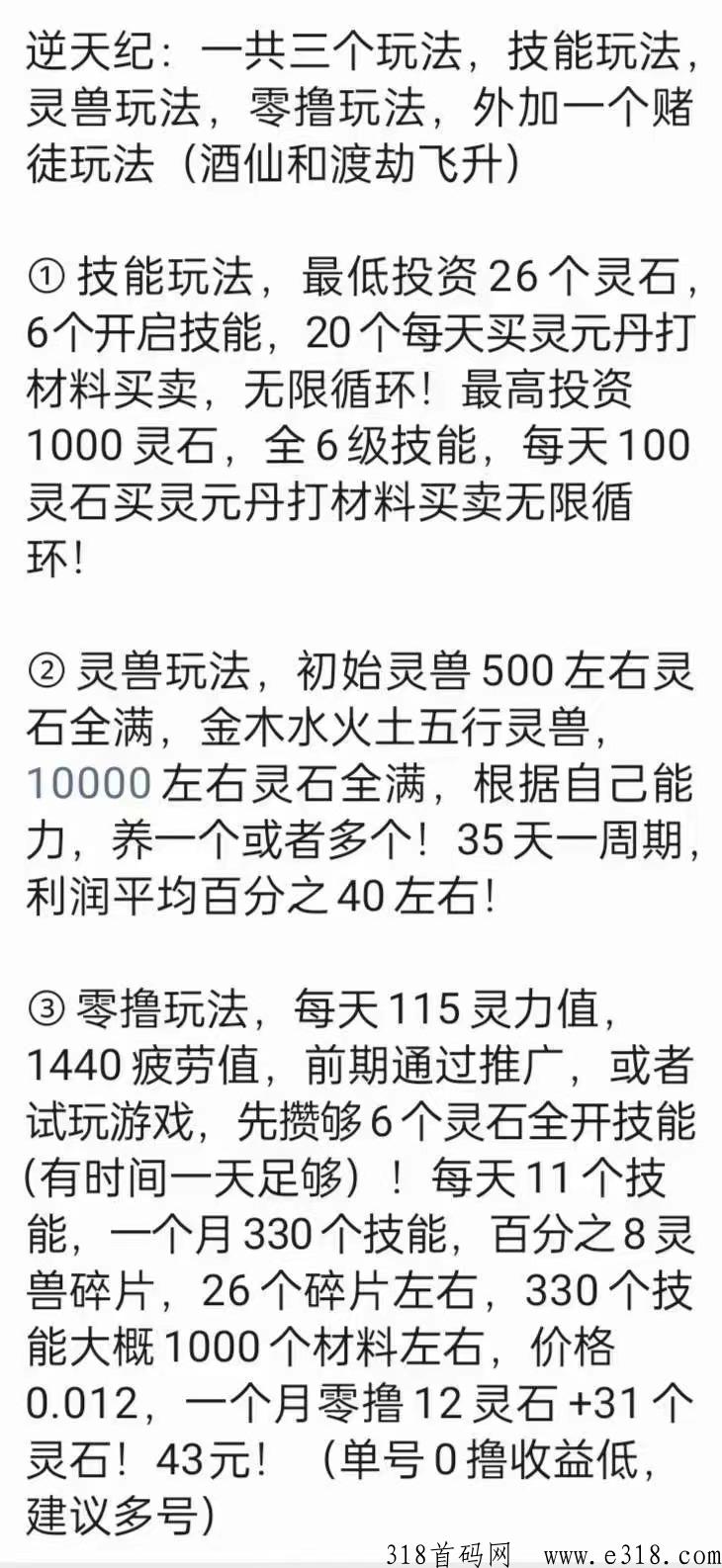 这次新项目逆天纪是,主要玩法是修仙;宠物灵兽养成(感觉是固定收益**玩法,养灵兽每天产蛋,产的蛋出售给官方换灵石,据说说后边会出灵兽蛋的玩法)+炼丹+悬赏试玩等玩法;