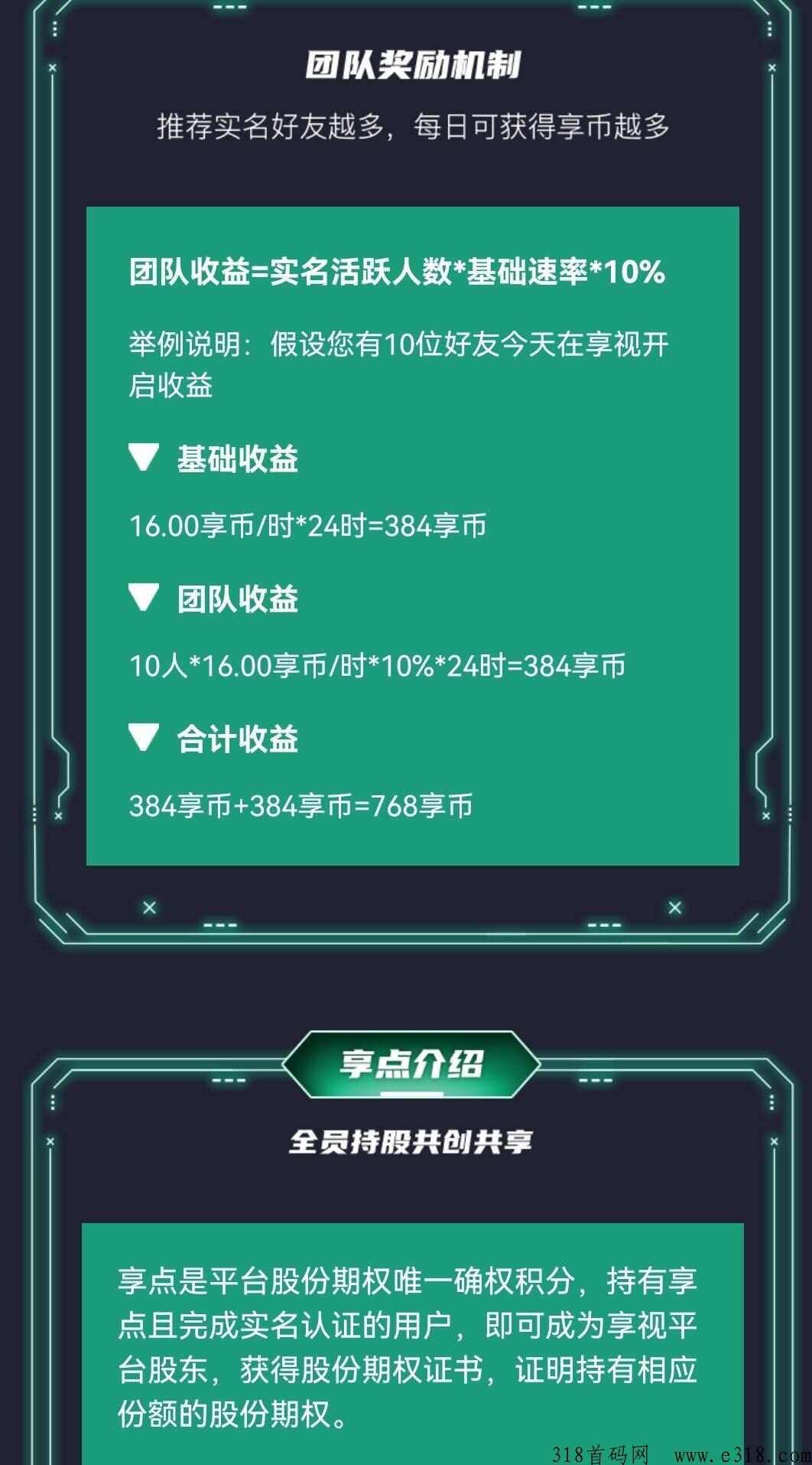 玩法:享币可通过免费实名后,每24小时刷10秒视频启动收益自动轻松赚取,邀请好友免费实名在线后,可以加速每天的享币收益。在线好友越多,每天收益越多。