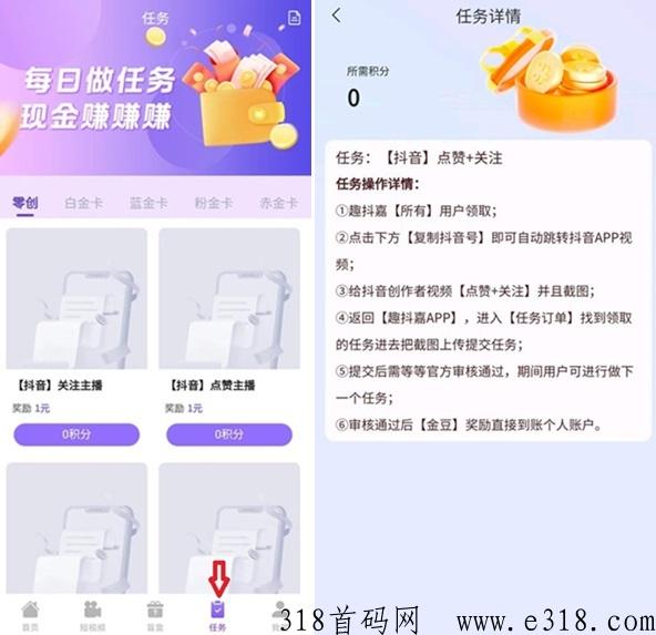 ②任务流程:点击任务,选择零创板块三个任务,点击会自动跳转到抖音。