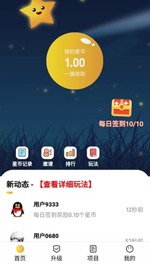 星推盟,注册星币,每天签到看广告得星币,试玩游戏得星币,1星币每天**0.26元,1元起提。