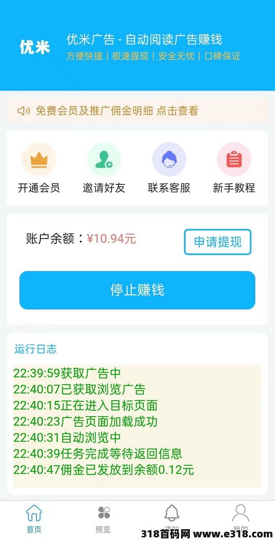 优米广告挂_机是一款集合了自动浏览广告、阅读挂矶、自动化点赞关注等方式手机自动赚钱的软件,安卓、苹果手机都可以使用,零元创收的最佳项目 ,有时间挂机就行 ,不需要你操作啥,点开即玩 ,自动赚米!纯脚本全自化动运行,无需人工全自动结合起来看广告3毛一条 ,一天可以看50~60条,每条15秒 ,保底一天赚15~18米(后期价格提高,每天可以净赚50元),免费加入优米联盟合伙人,只要你去干了,百分百都有收益,当天就能见到努力挂矶带来的丰硕成果!