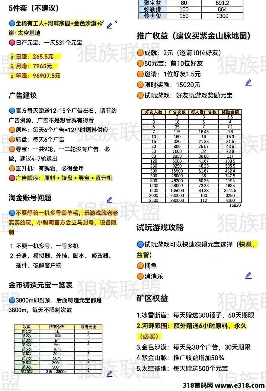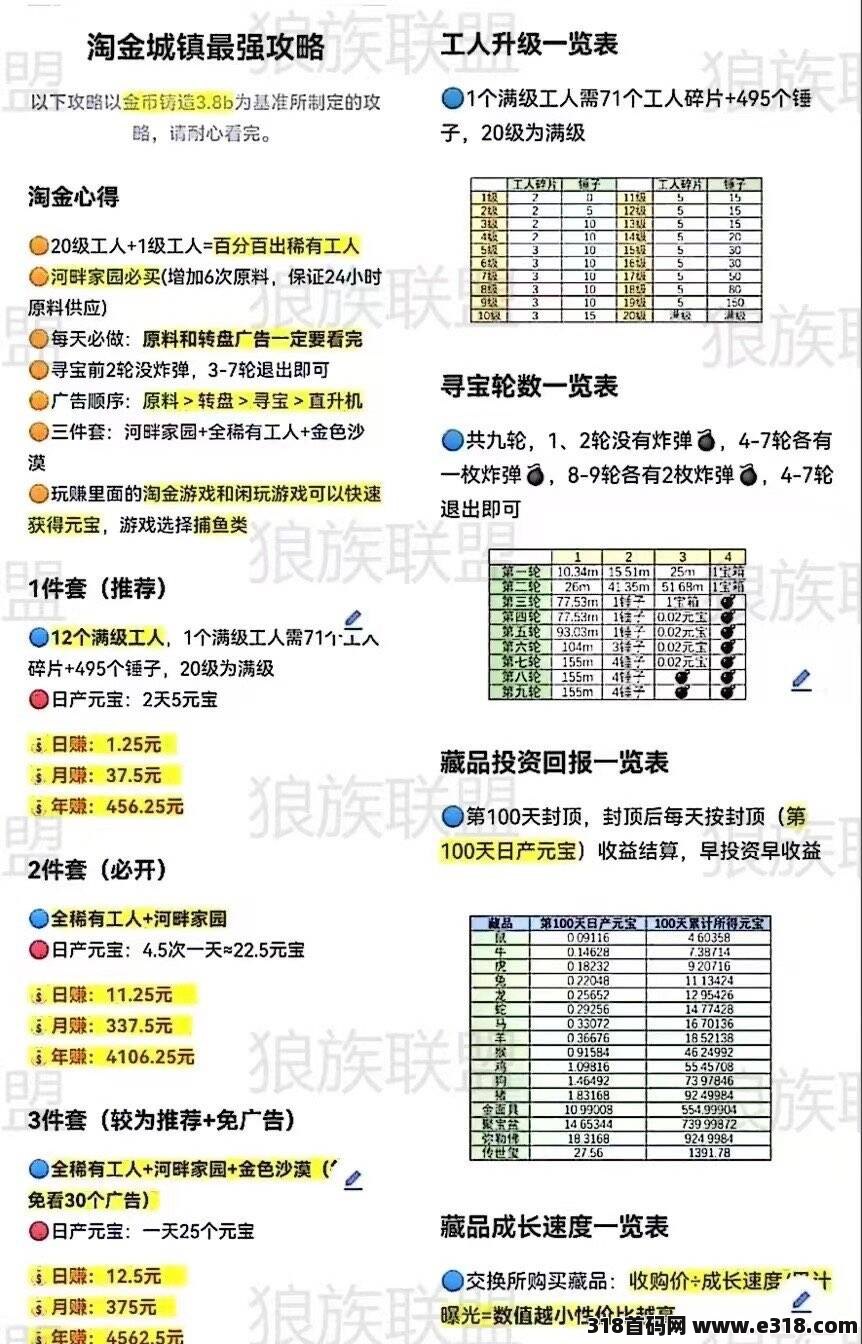 一、零撸攻略:(基本攻略)开局第1天把新手教程过完,就先去把每天的6次,原料搞一下,然后又去先去做直升机土豪/或者寻宝/大转盘,寻宝下面有玩法(寻宝优先,广告多的随意)直到把元宝攒到15个,将所有工人升到5级,花费12.08元宝(360锤子+96碎片),产量139m/12小时,然后把广告都看完第1天就结束了。