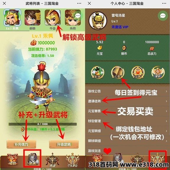 铜币可用来升级武将,元宝可提现,也可补充武将体力、解锁高级武将。